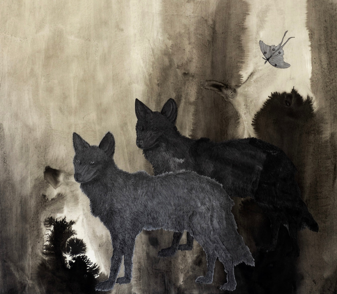 The work in Waking Dreams draws from these fleeting, in-between moments: the visual language of the subconscious as it flickers at the edge of awareness. Through expansive Sumi ink washes on Japanese paper, layered with printed imagery and watercolor, the series mirrors the unpredictable rhythm of this altered state. The process itself becomes a conversation between control and surrender, the spontaneous flow of ink standing in for the uncontrolled currents of dream, while consciously added details respond to and shape what emerges.