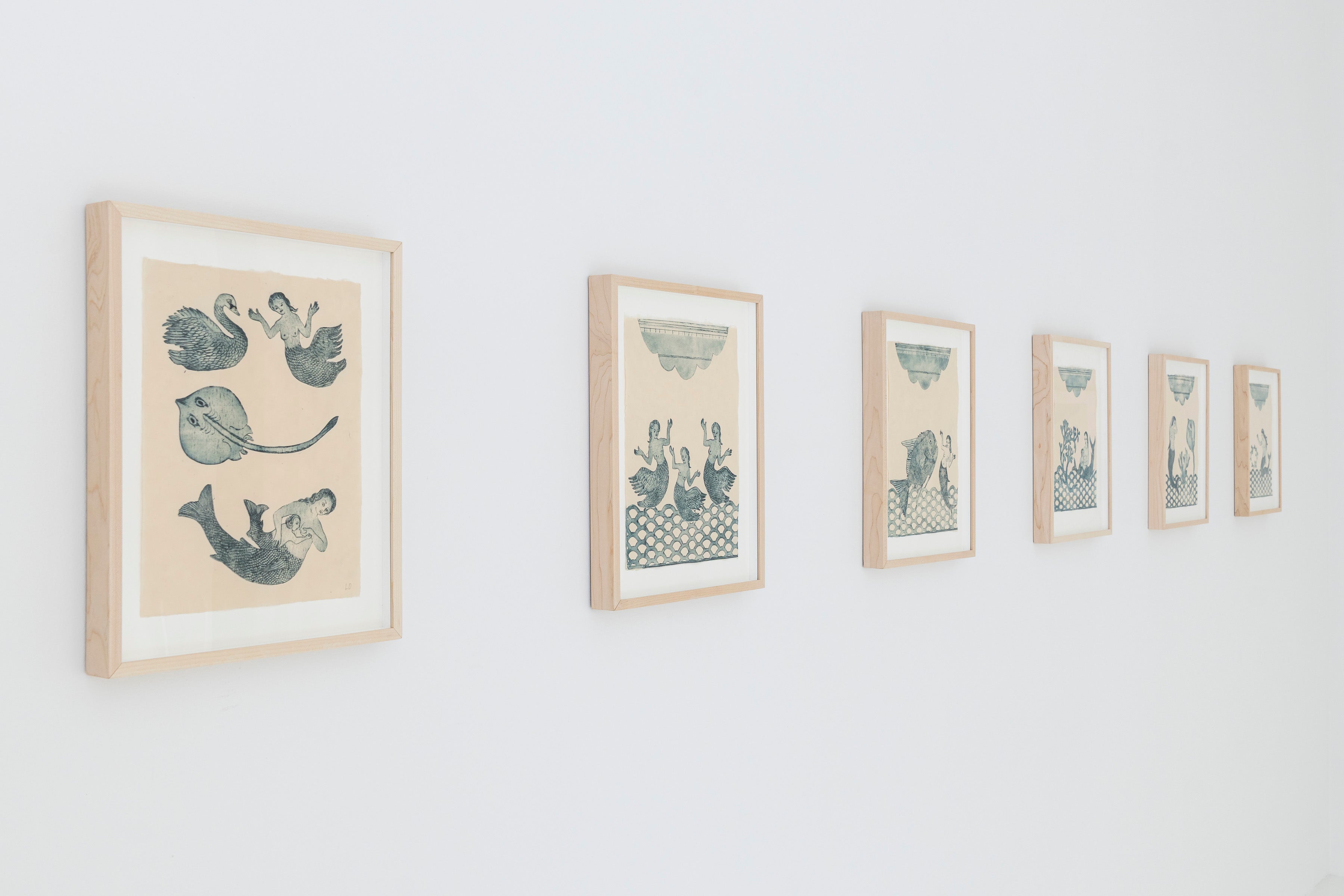 Created by a peripatetic printmaker who divides her time between New York, the French Pyrenees, and New Zealand, the works in Swimmers are produced using an inventive and transportable technique. Drescher prints from recycled TetraPak cartons, creating featherlight plates that allow her to carry an entire menagerie in a suitcase. The use of reclaimed materials, including found and recycled paper, has been a consistent thread throughout her practice, aligning material processes with ecological consciousness.