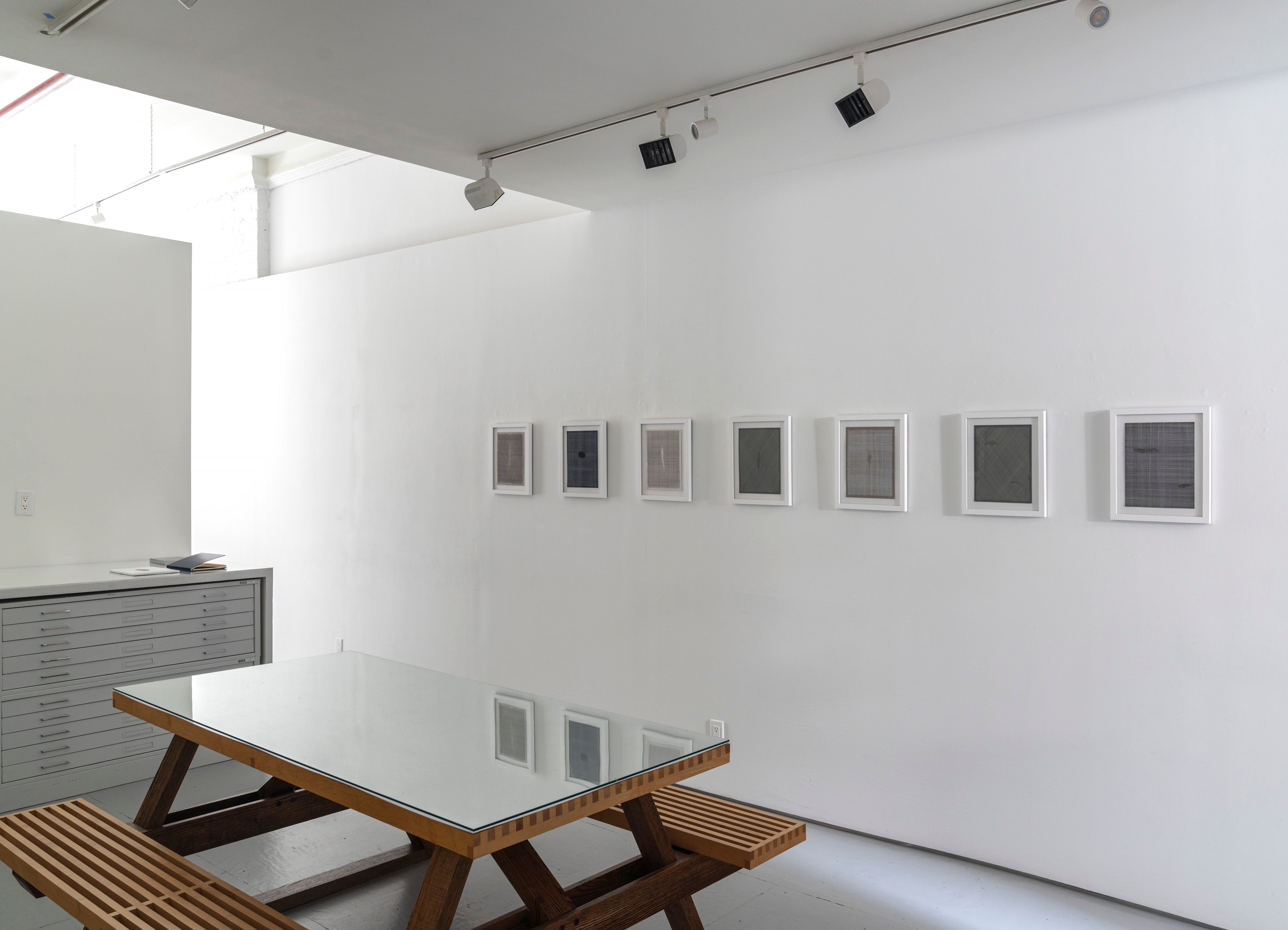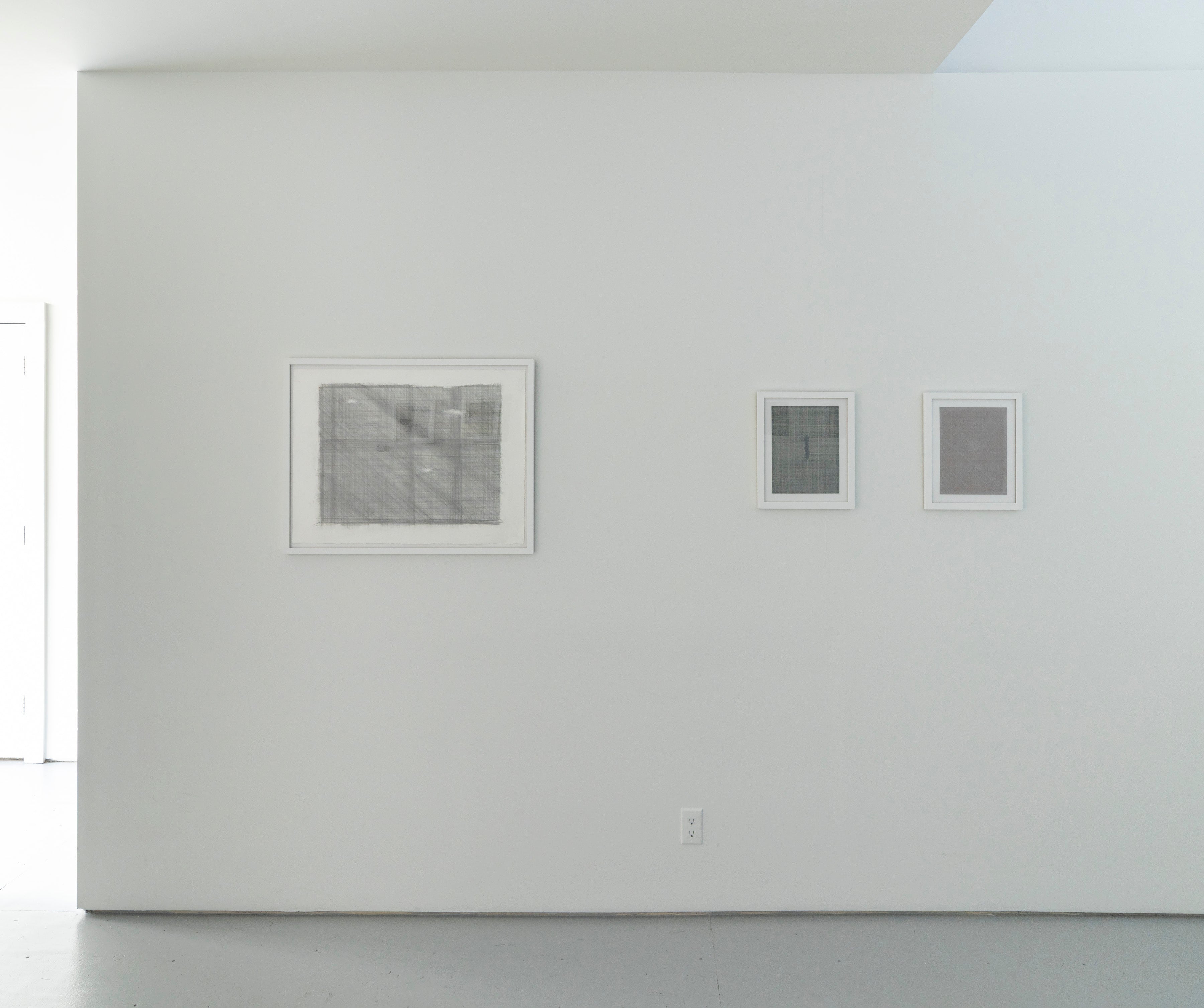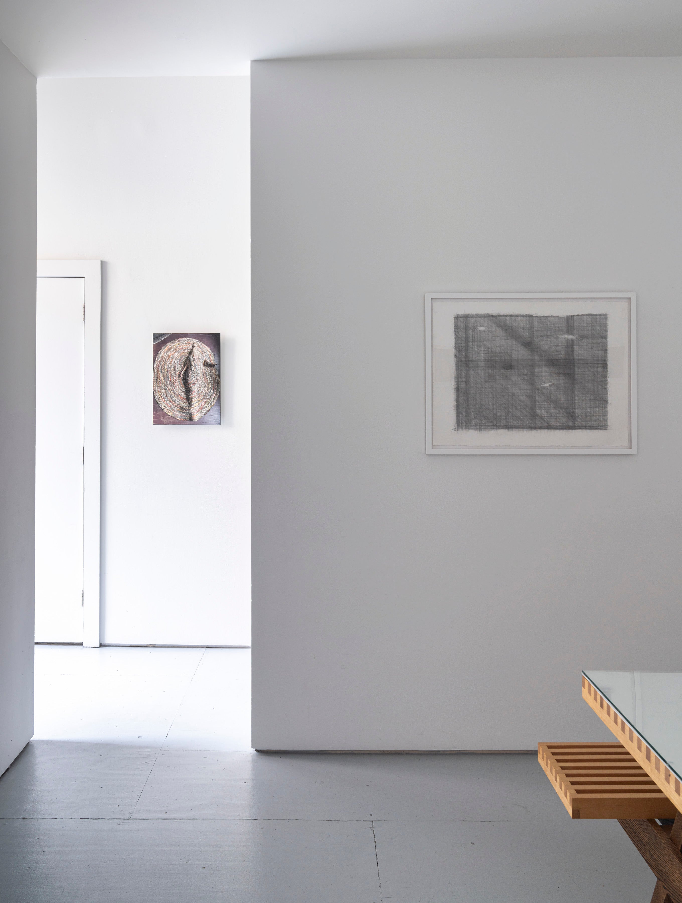 The drawings in the exhibition represent another form of assembly: line by line, strand by strand, they gradually form a collective of threads. The act of drawing—of witnessing—restores strength, even when threadbare patches and tears threaten stability. This process is akin to weaving: each line helps create a community, and their alignment suggests the idea of fabric. They “open a sentence,” as Sheila Hicks puts it. Duffy uses tailor’s pencil, dressmaker’s chalk, and graphite on cotton rag paper—tools connected to garment making—to emphasize how phenomena mirror one another, serving as a reminder to remain aware and to avoid forgetting.