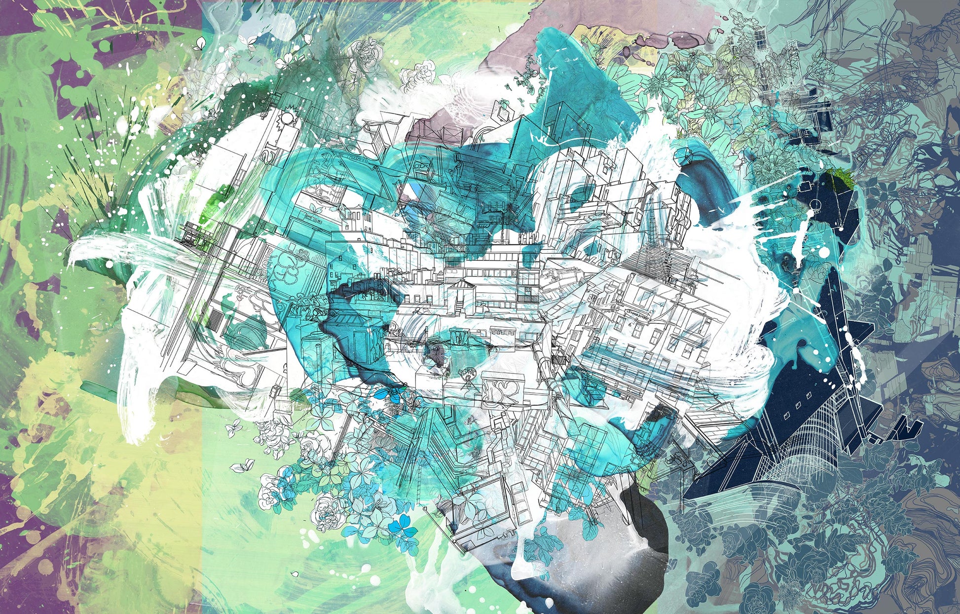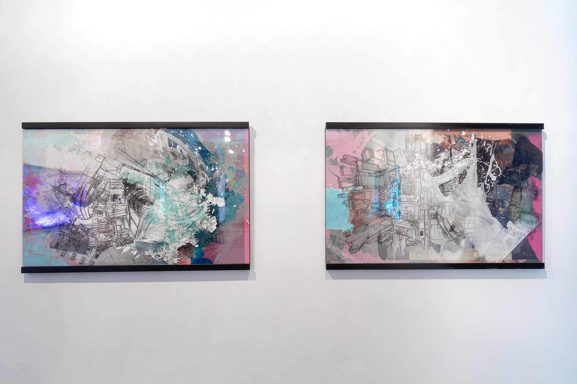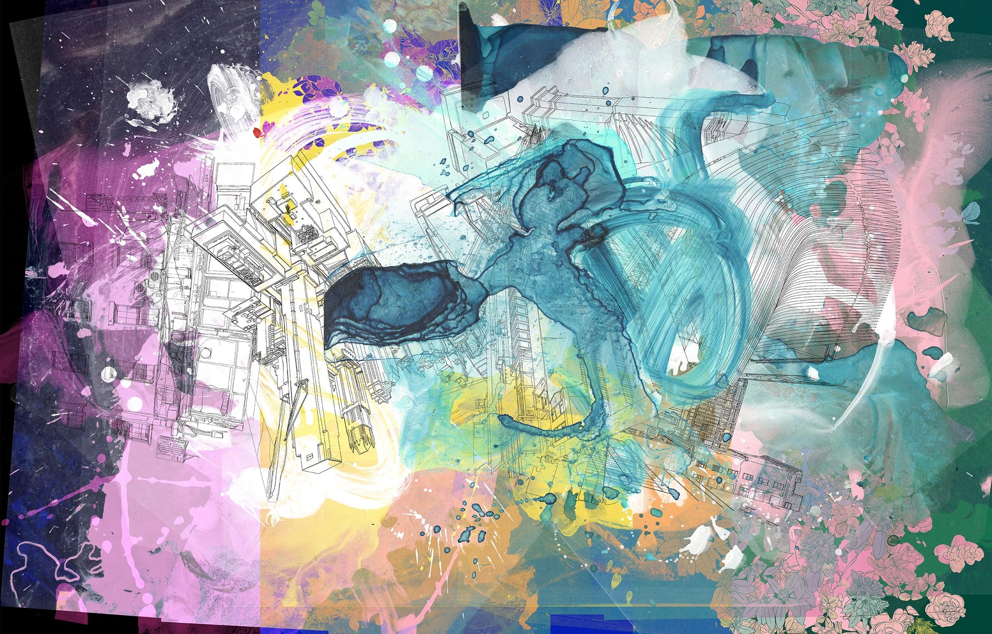 These paintings’ first layer is water-based and free-form, taking days to dry. It’s a process I feel brings an organic quality that’s sporadic, free, and dynamic, contrasting with the rigid architectural drawings layered over them. Their result reminds me of erosion, fluidity of water, and topographic lines. The paintings are a product of time, slow drying, and more often shepherded into their final form in ways more instinctual than just moving a brush over the canvas. I work in transparent layers, pulling them apart so their differences highlight and hide previous layers, much as our cities and nature do.