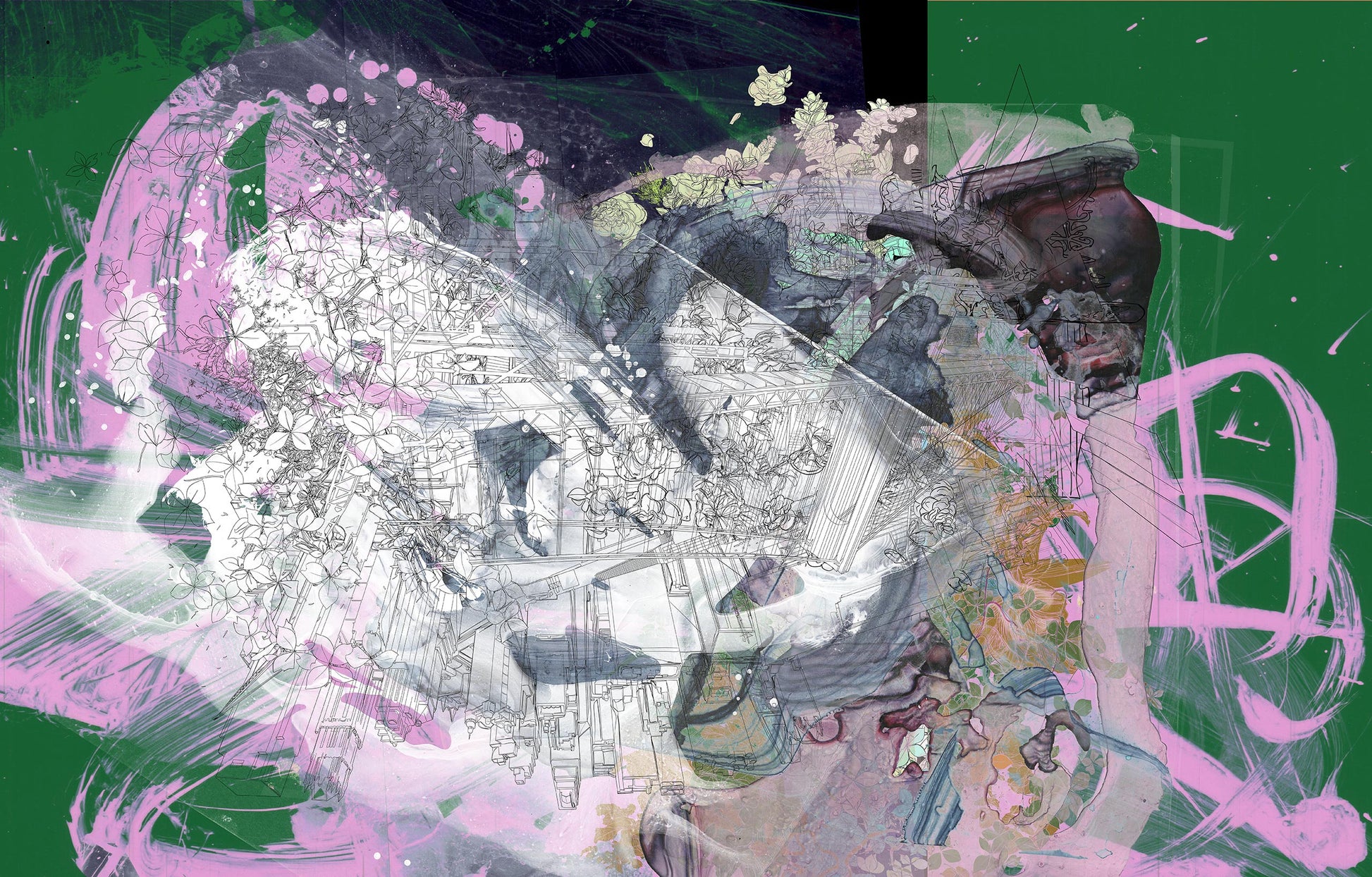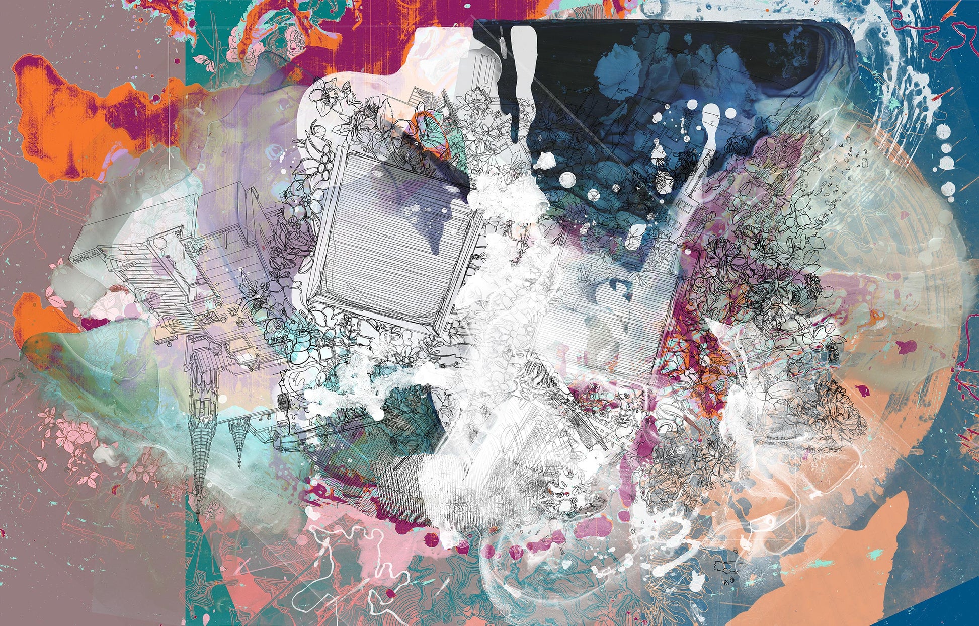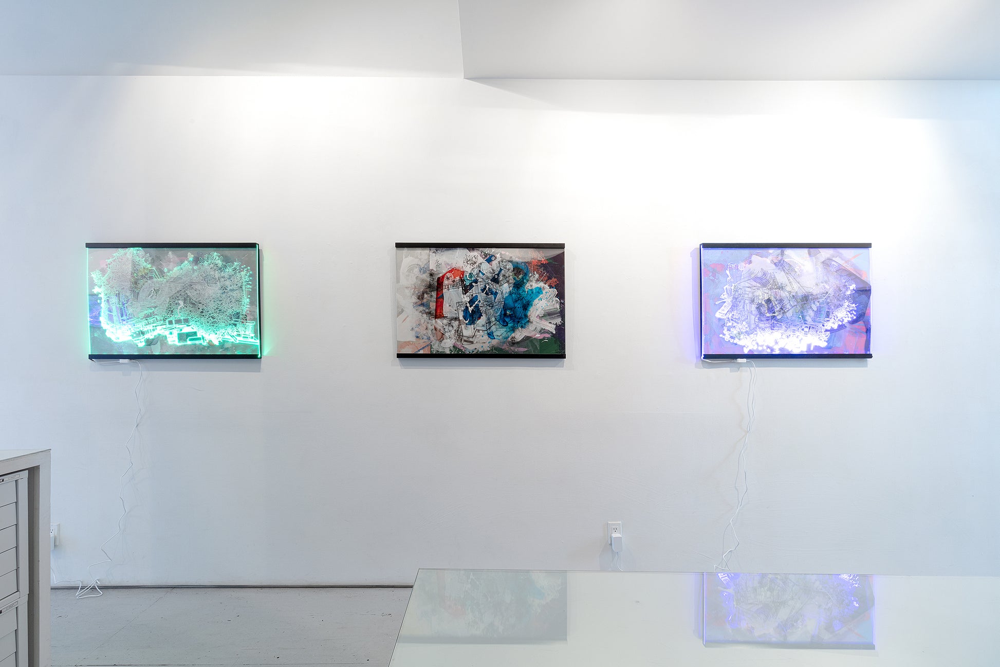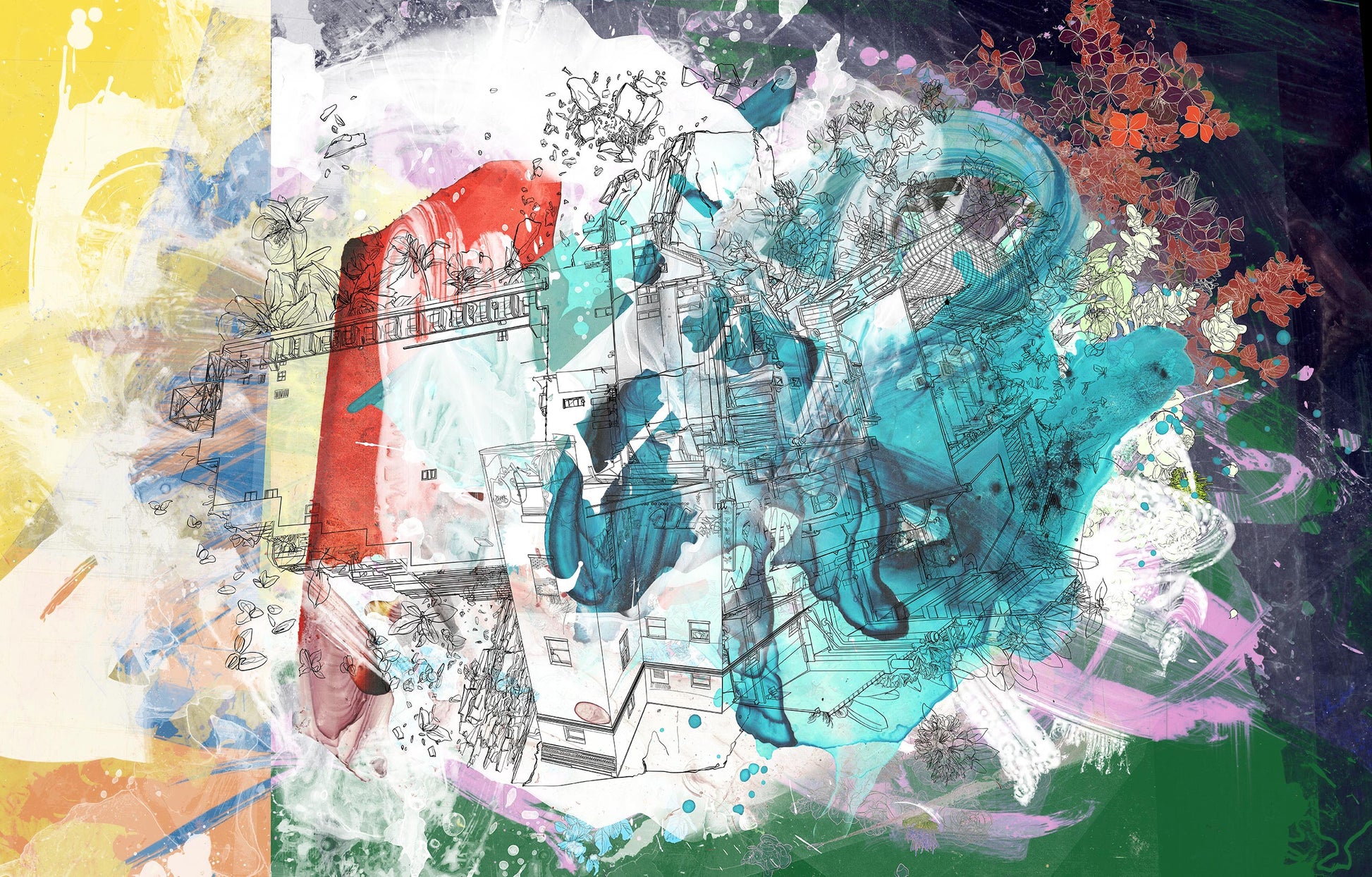 These paintings’ first layer is water-based and free-form, taking days to dry. It’s a process I feel brings an organic quality that’s sporadic, free, and dynamic, contrasting with the rigid architectural drawings layered over them. Their result reminds me of erosion, fluidity of water, and topographic lines. The paintings are a product of time, slow drying, and more often shepherded into their final form in ways more instinctual than just moving a brush over the canvas. I work in transparent layers, pulling them apart so their differences highlight and hide previous layers, much as our cities and nature do.