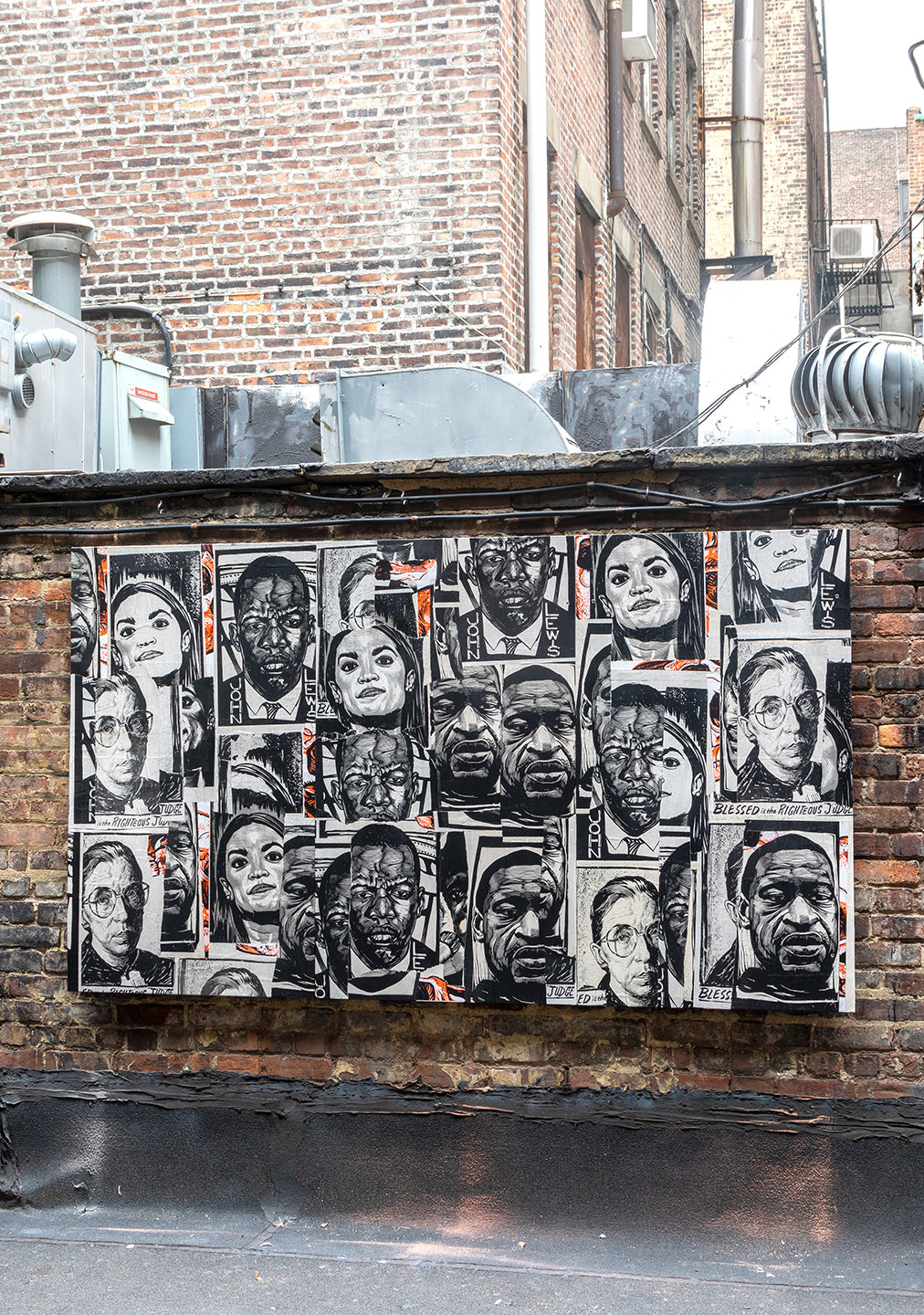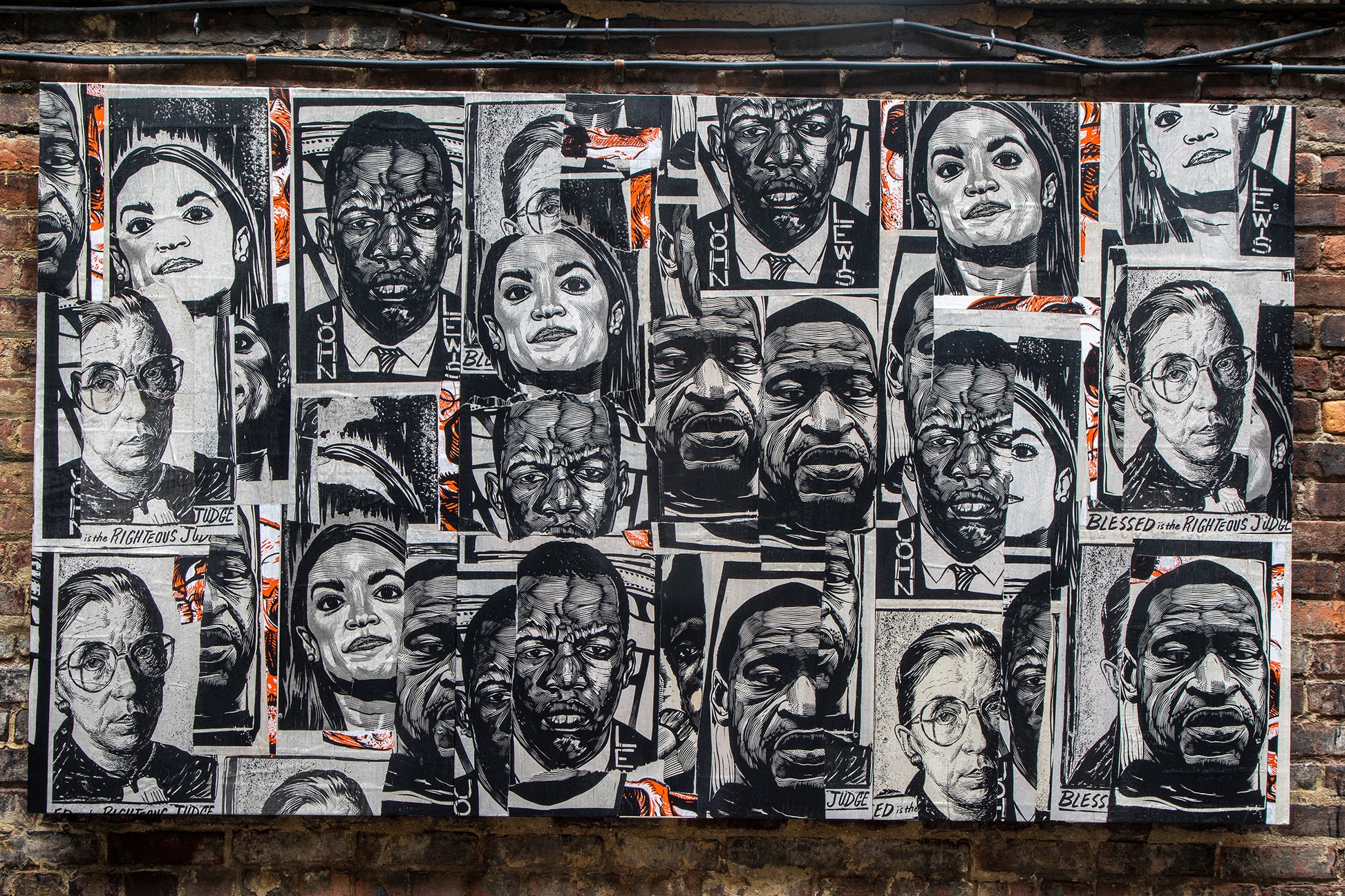 As Minneapolis and the world mourned the murder of George Floyd in the summer of 2020, an outpouring of art was created by artists, professional and amateur alike—murals, sidewalk art, sculpture installations, cardboard signs, paintings, drawings, and prints. The works were made to memorialize Floyd and countless other Black citizens martyred in this country, to protest racial injustice and police brutality, and to try to help communities heal. Barthold, a New York printmaker and street artist, completed this powerful memorial portrait of Floyd just days after he was killed. The artist subsequently produced other portrait prints of important Americans—John Lewis, Fred Hampton, Ruth Bader Ginsburg, and Alexandria Ocasio-Cortez—to, in the artist’s words, “remember the lost and honor the living.” Barthold mass-produced these likenesses and pasted them around the city of New York throughout the summer of 2020, and, again, in a campaign just before the 2020 election. To broaden their reach, he shared the images on social media, and sold the prints online, using the proceeds to raise money for Black Lives Matter and the Bail Project.