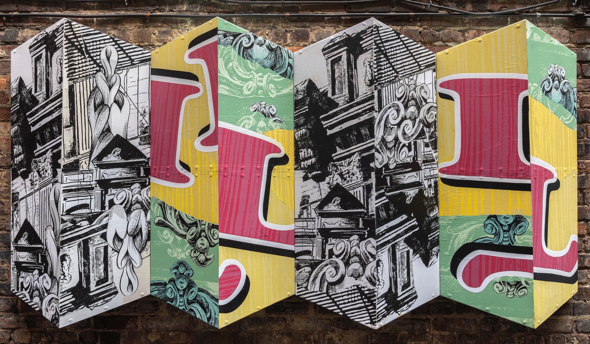 I’ve been fascinated for some time by how printed matter is changed by its placement in a public setting, especially as posted on street furniture such as lamp posts, mailboxes, signal boxes, and existing signage. Once the print is no longer flat, it seems to unfold as we move past it, revealing itself only through our movement. The erosion, overlapping, and defacement of the print over time on the Street often add to its interest before eventually erasing it altogether. I anticipate and welcome the effect that exposure to the elements may have on the sculpture during its time outdoors at the Gallery.