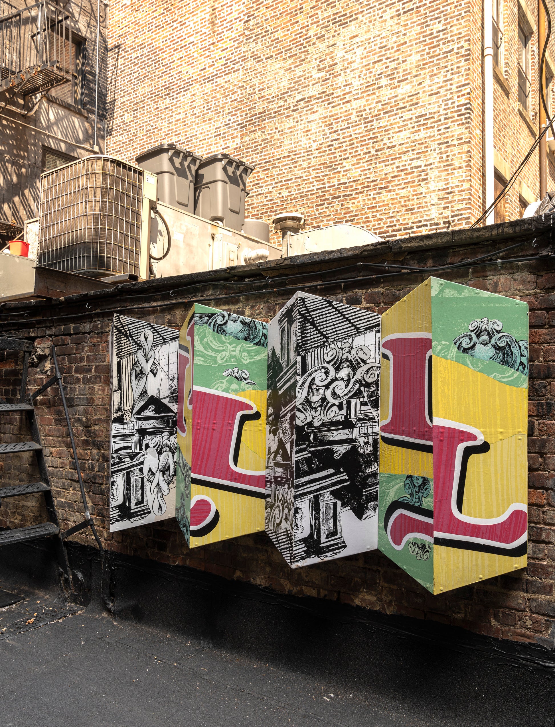 I’ve sampled the architectural and commercial treasures offered to the eye by Tin Pan Alley to create a sign sculpture of the same name. Given the many available images, I could have made a dozen such sculptures. I was most attracted by the facade of 49 West 28th Street, including the cornice and pediment, the soot-streaked signage of the storefront, the beautiful copperwork panels of 38 West 28th Steert, and the carved stone jambs flanking the entrance to 50 West 28th Street. The prints covering the sculpture are all silkscreens, printed at Gowanus Studio Space from freehand drawings. The substructure, crafted from 20 gauge mild steel, was cut, folded, riveted, and welded together in the metal shop at GSS.