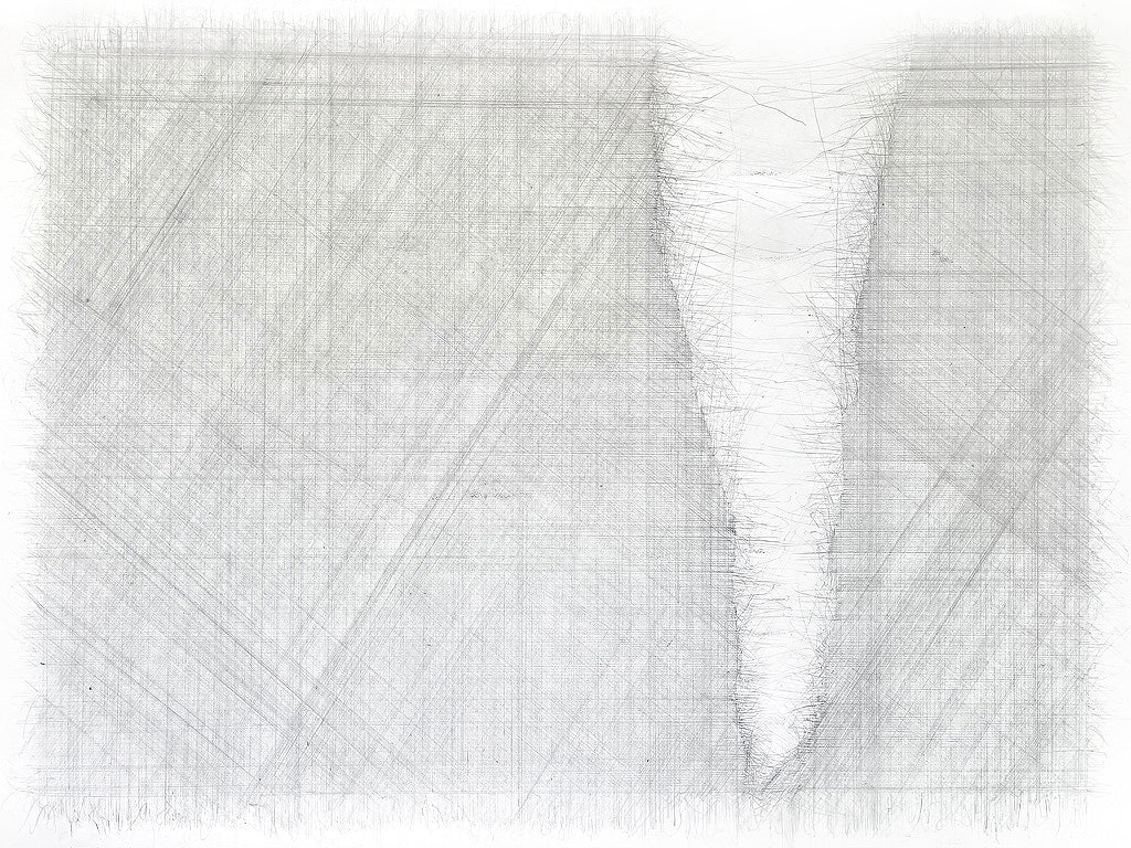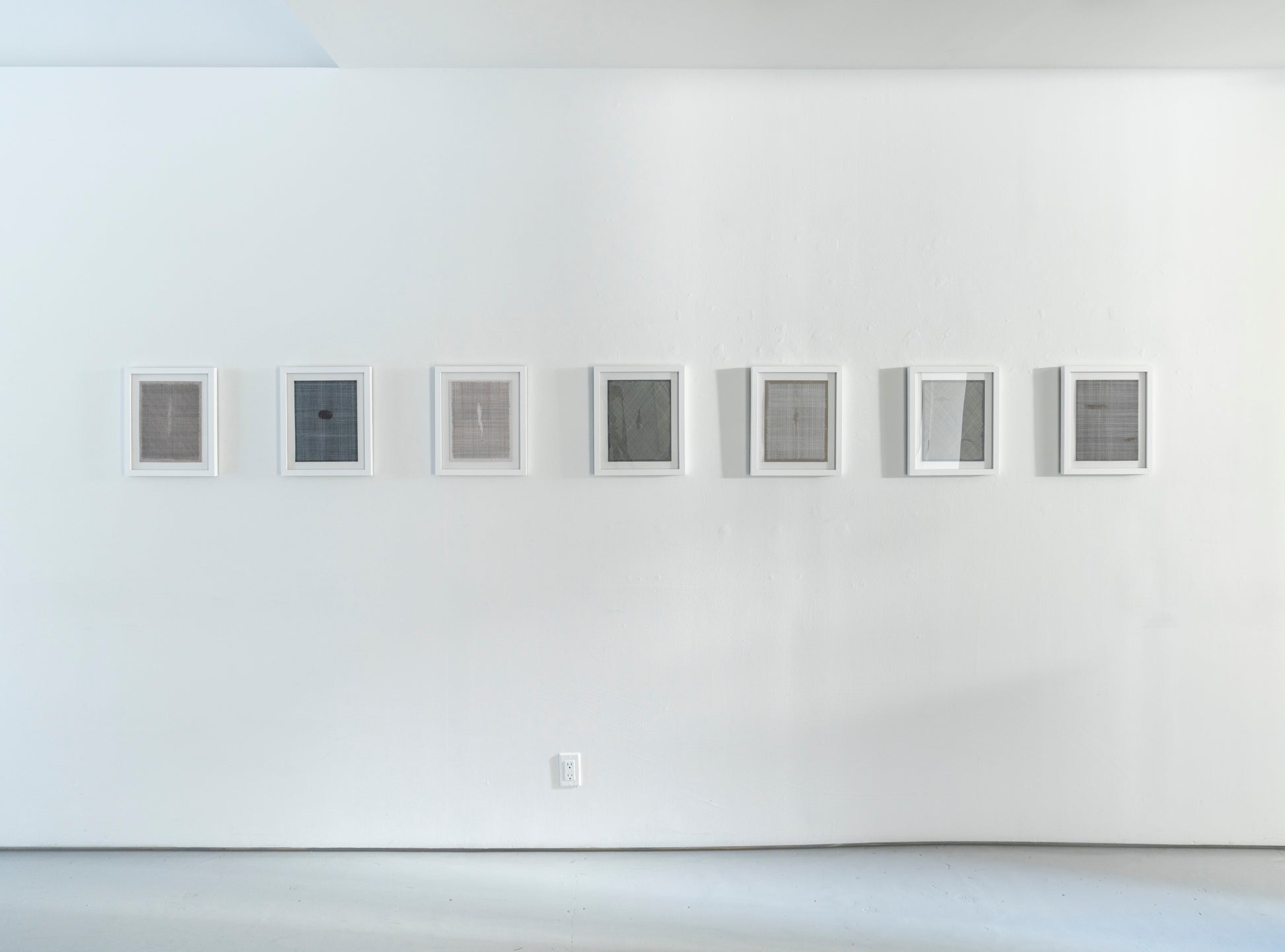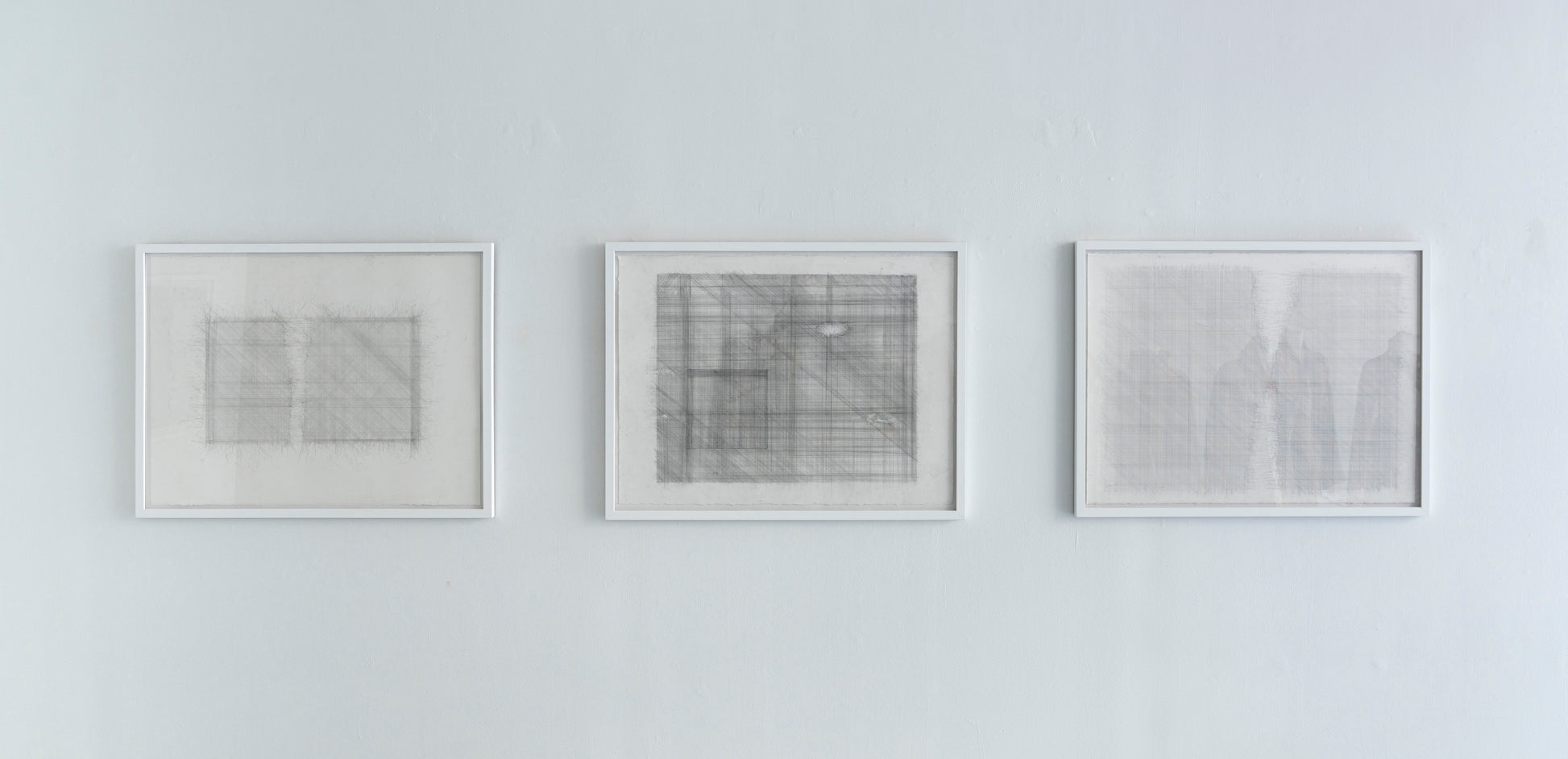The drawings in the exhibition represent another form of assembly: line by line, strand by strand, they gradually form a collective of threads. The act of drawing—of witnessing—restores strength, even when threadbare patches and tears threaten stability. This process is akin to weaving: each line helps create a community, and their alignment suggests the idea of fabric. They “open a sentence,” as Sheila Hicks puts it. Duffy uses tailor’s pencil, dressmaker’s chalk, and graphite on cotton rag paper—tools connected to garment making—to emphasize how phenomena mirror one another, serving as a reminder to remain aware and to avoid forgetting.