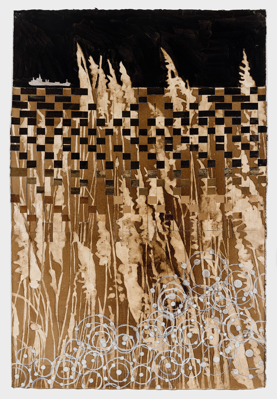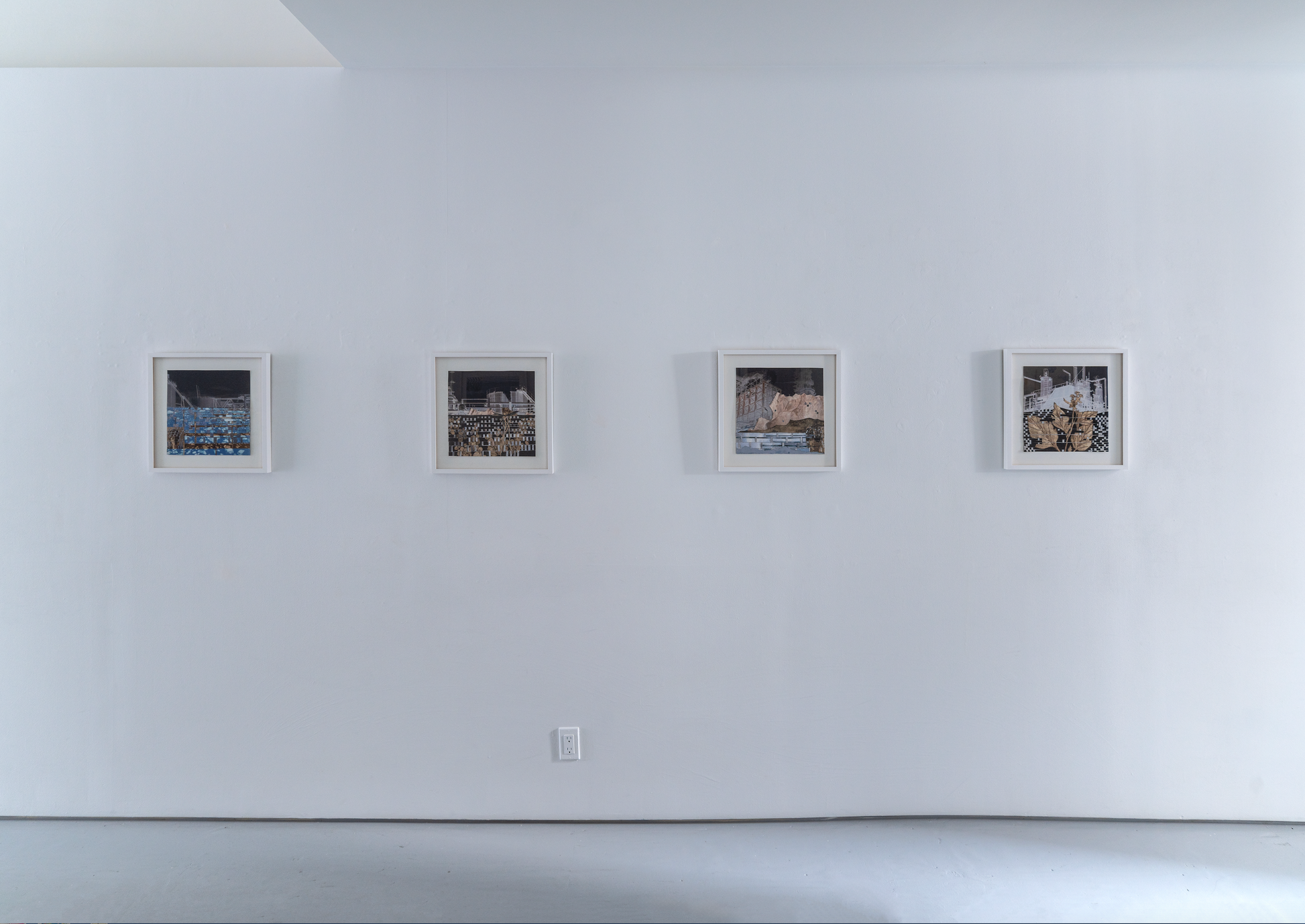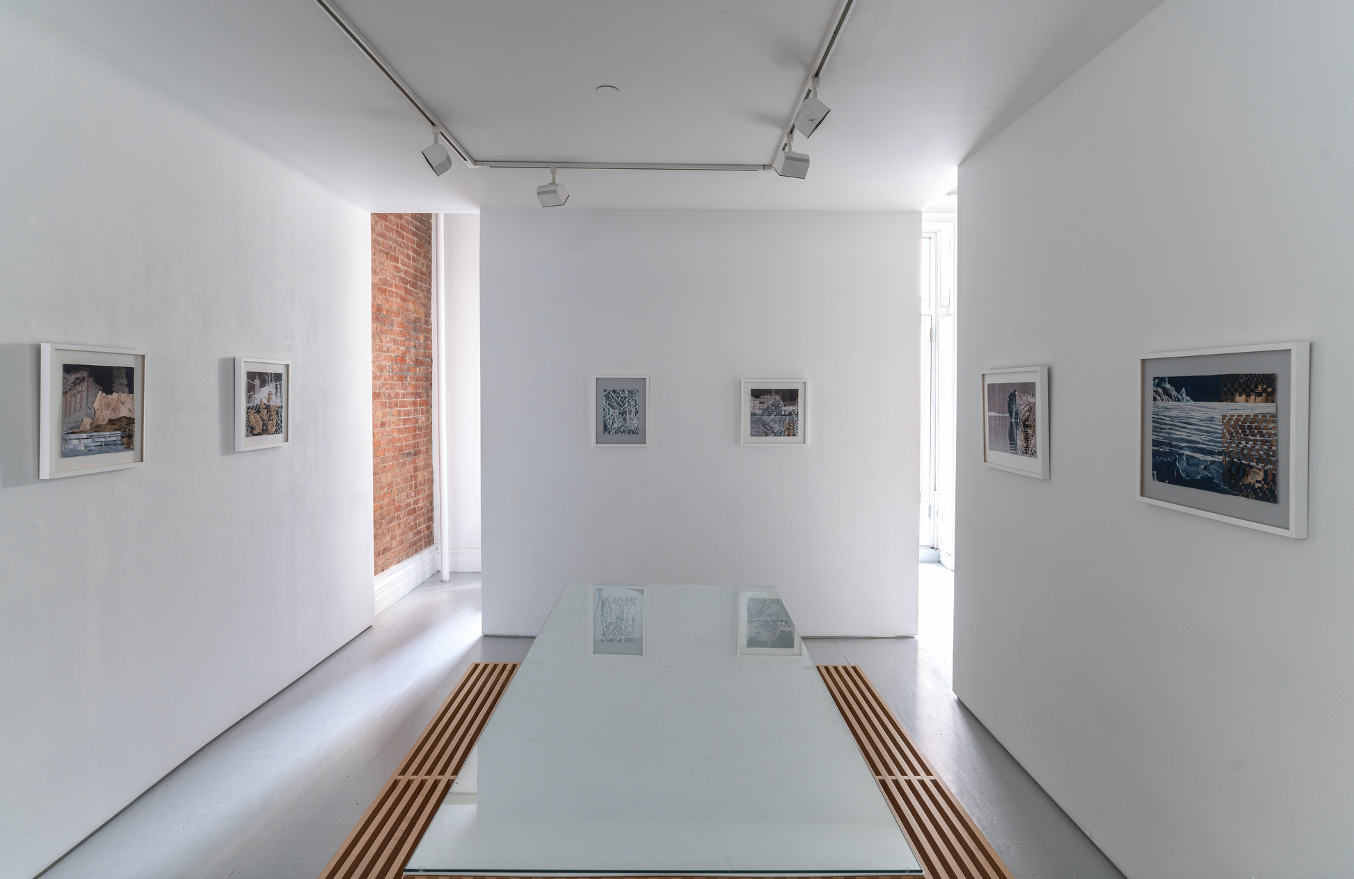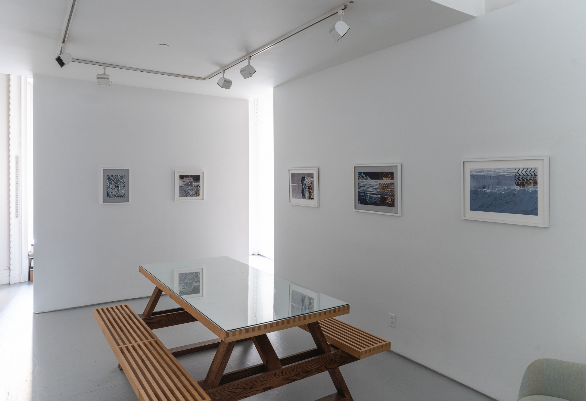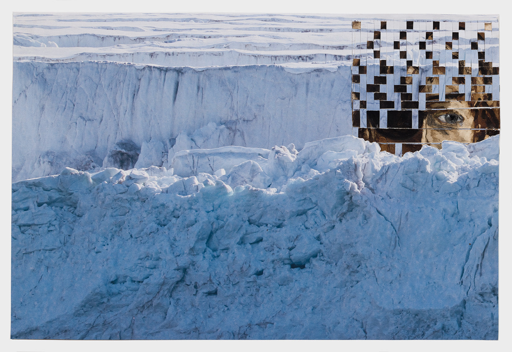 The drawings in the gallery’s second room are self-portraits cut into the weft and then woven into a warp cut in a landscape. The landscape images depict scenes brought on by global warming: melting glaciers, dying trees, and more. The structural matrix of the woven paper connotes the inextricable connection of each individual to the fate of our warming planet.