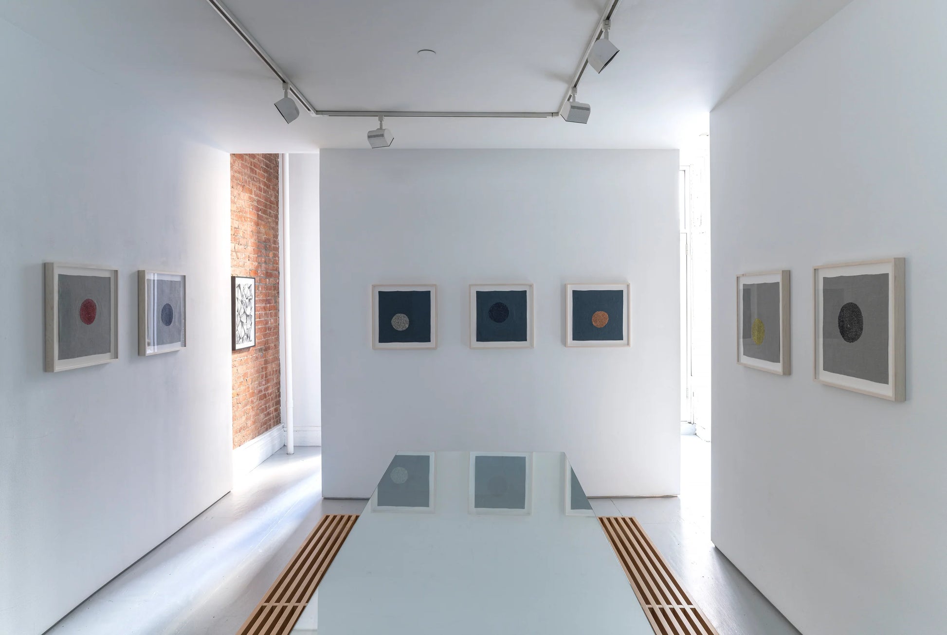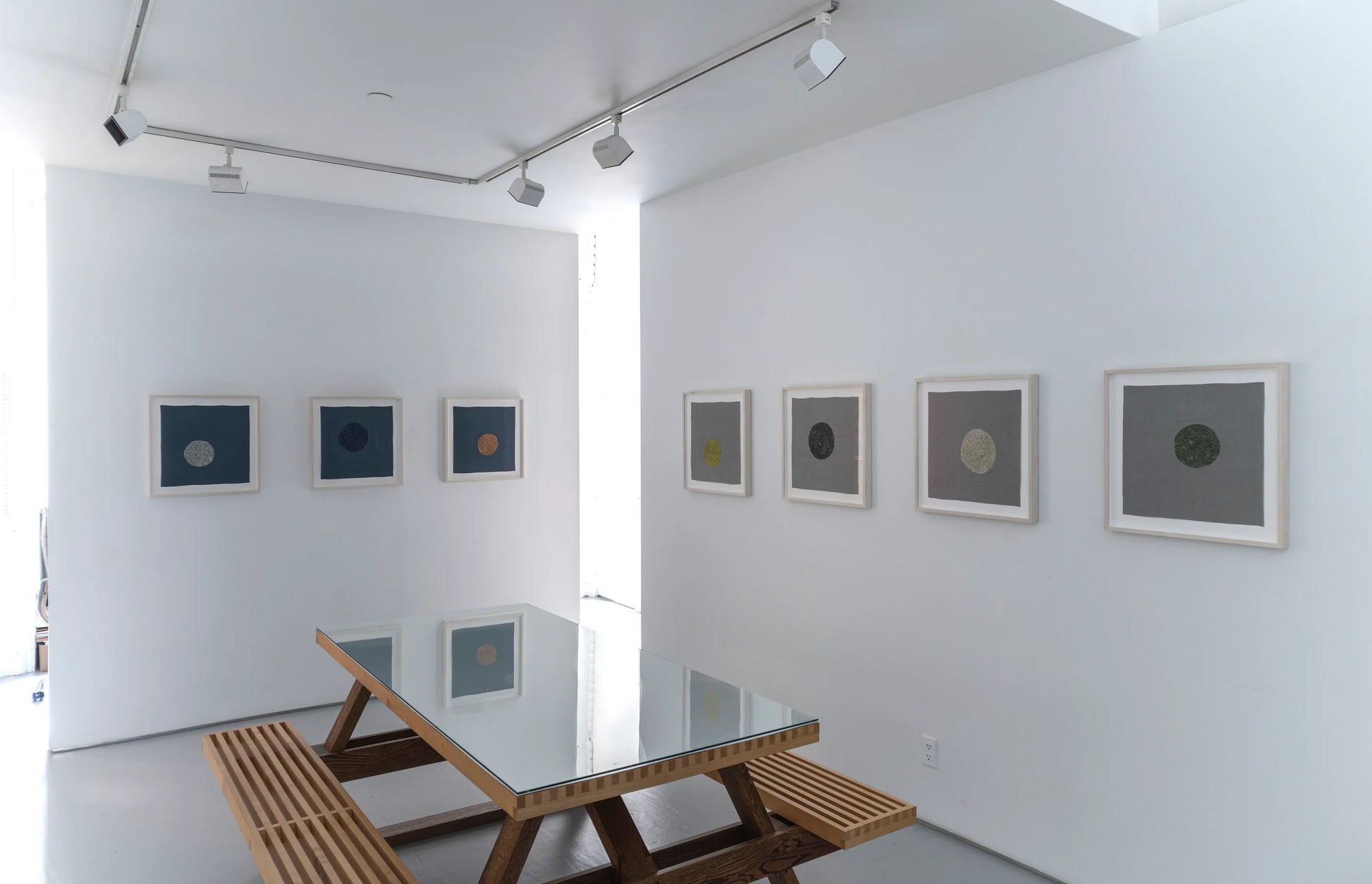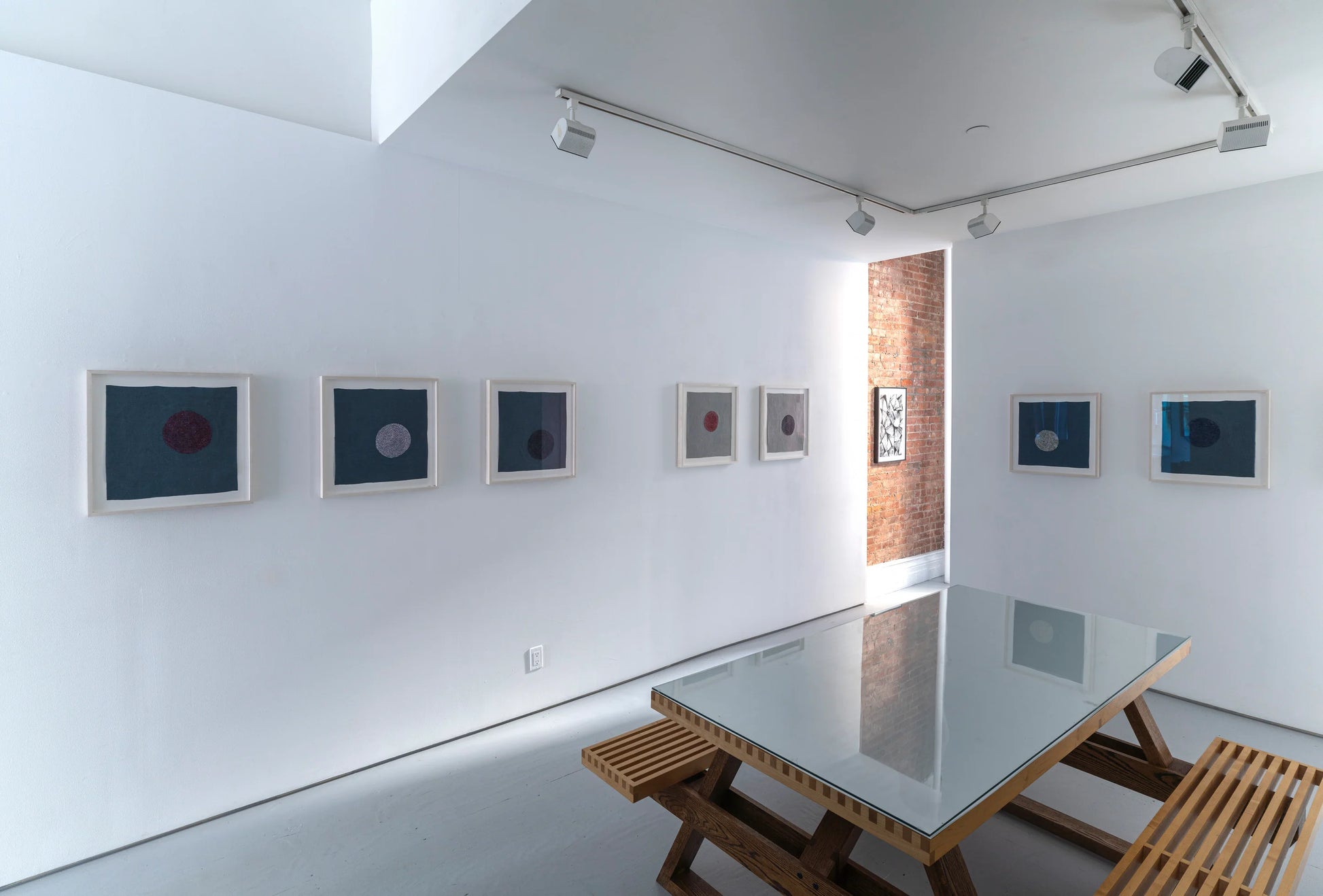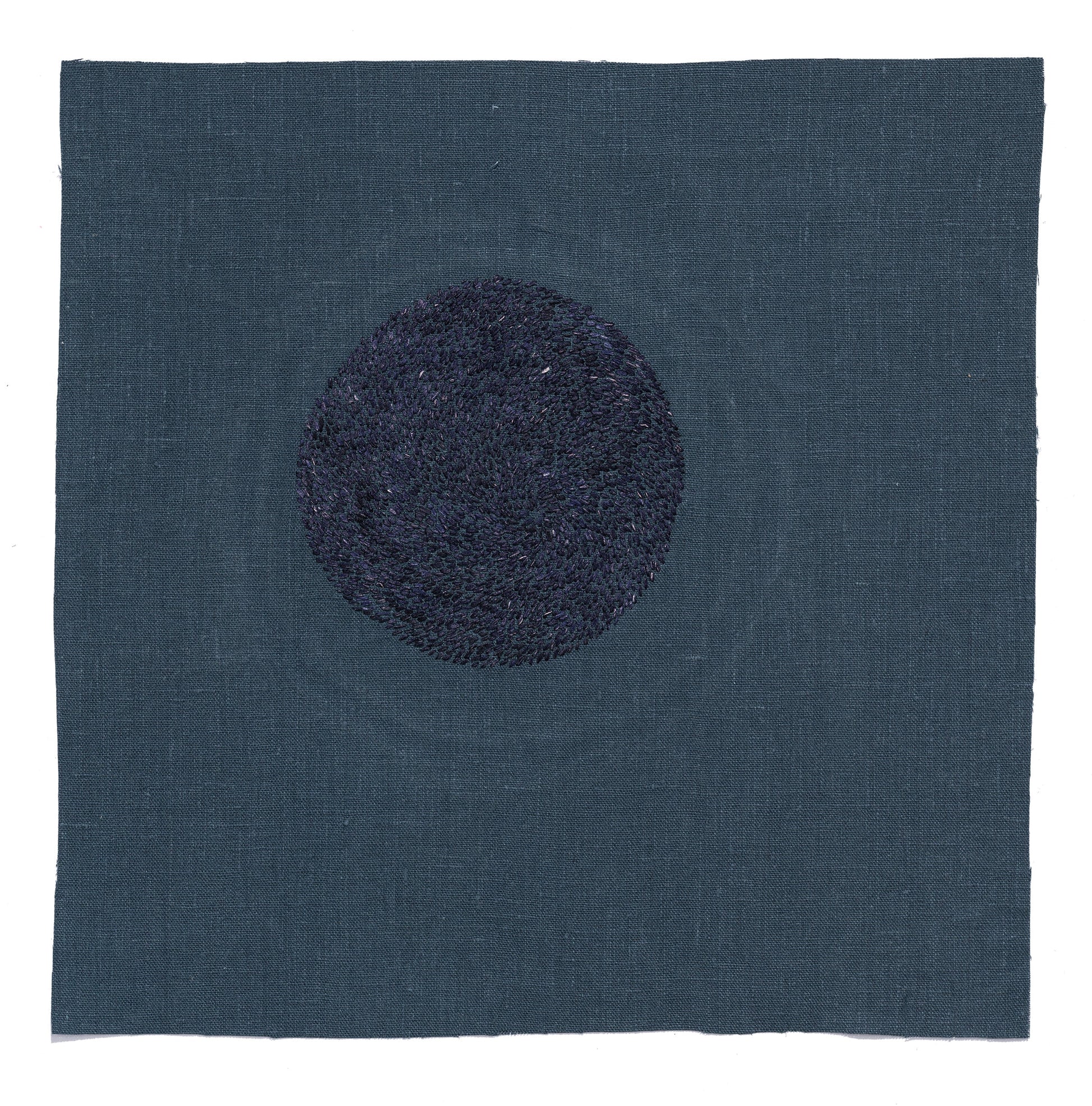 still—moving brings together a series of stitched textiles that chart a period of suspended time and stalled movement. Each embroidered orb floats or drifts within its field, propelled by a rotational energy as if still forming, still finding its place. Viewed close up, variations between the tiny stitches become distinct, imperfect, tender. Trusting in a rhythm set by her materials, she seeks a kind of restless coherence in the form. For Heather Watkins, this process is both meditative and obsessive—it requires and reveals different kinds of attention. Like unwitting filters, these works absorb and transmit time.
