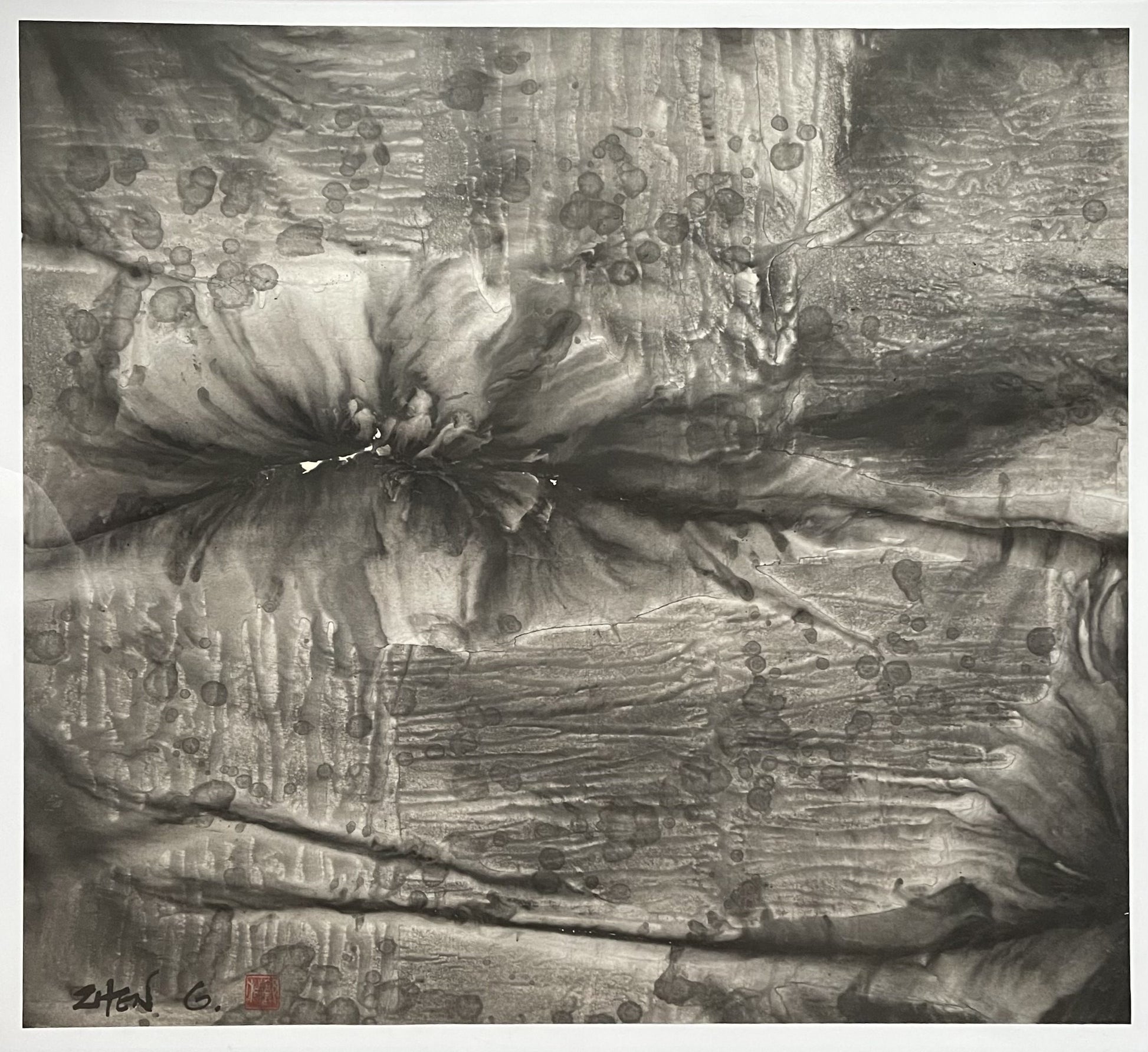 Muted Landscape shows a view of our earth that is at once expansive and frightening. Images present a landscape as if seen from miles high, muted and defaced by both the gray color and the great height. High peaks and rivers, lakes, caldera fields are joined and blended, losing their individual features and value. But “muted” has meaning beyond toned down. The earth, disappearing before us under the advance of population and industry, is not able to call out. Our earth, the mother of us all, is silenced as pieces are dismembered and burned. So to the mothers and women of this world, their bodies, and their rights are continually under attack. They, too, are told to “shut up” and their voices are not heard.