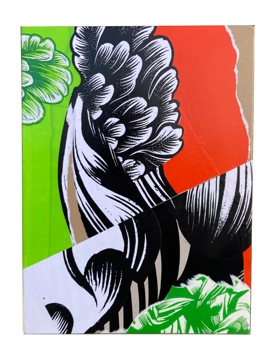 I harness this riotous profusion on paper, canvas, and wood and give it form. What begins as a print may become the surface of a sculpture. The curve of a bandsaw cut may call for a blush of color, a change in shape, or a spray of brushwork. There is no plan. I follow the prompting of the work as it progresses, and it is only resolved in the final combination of parts.