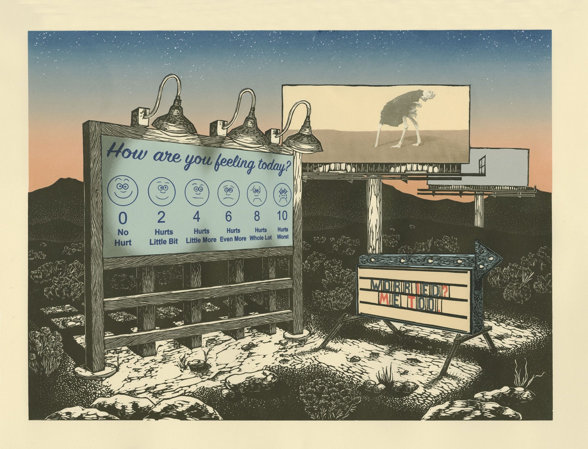 The image and text relationships in my work depict contemporary anxieties that I hope resonate with viewers. I give voice to frustrations centered around uncertainty, inequity, and deeply rooted political and social problems that appear too vast to be changed by the actions of individuals. Among the shared experiences I depict, I find myself compelled to grapple with imposter syndrome, burnout, and trying to survive the hellscape of late-stage capitalism.
