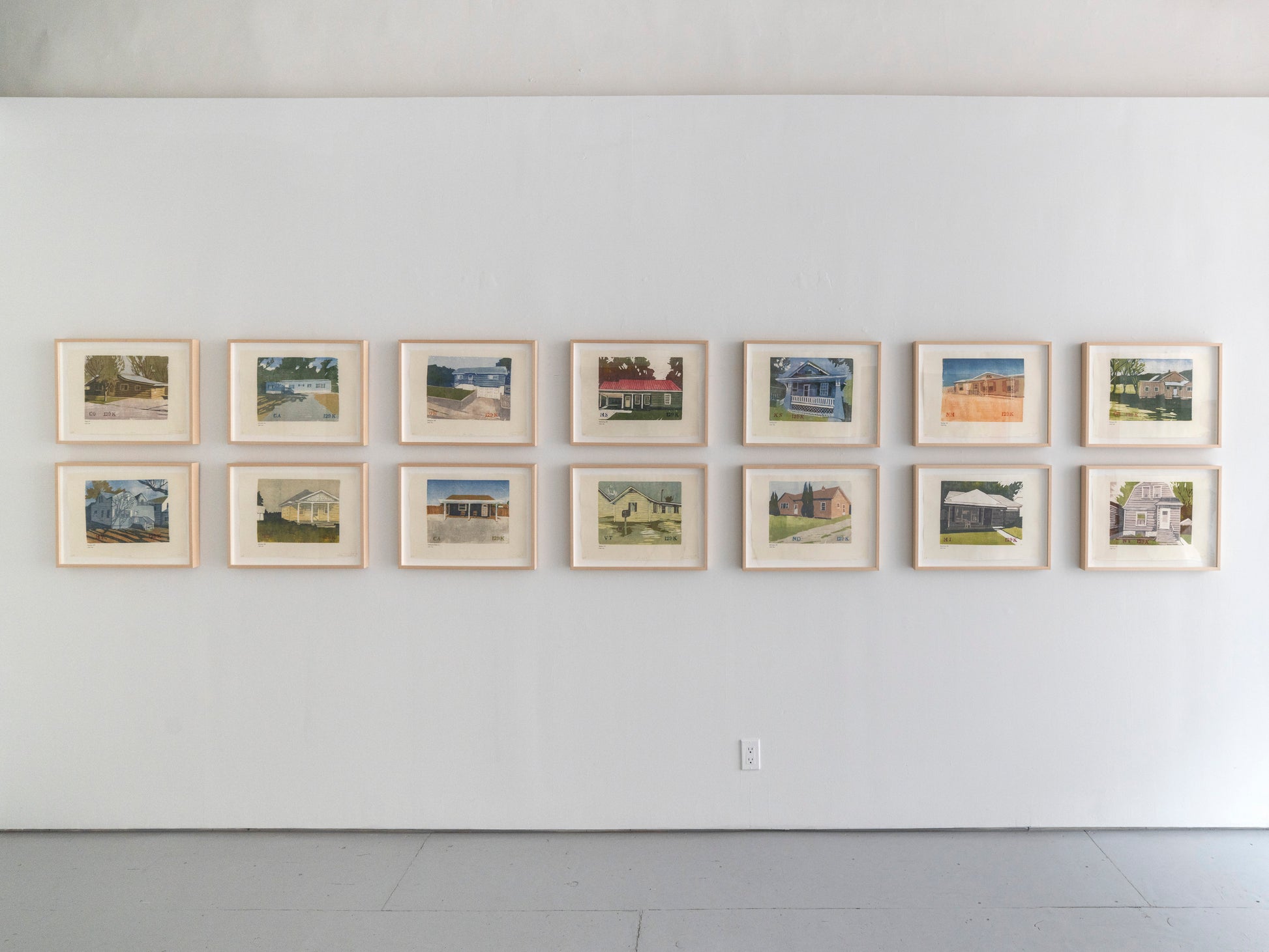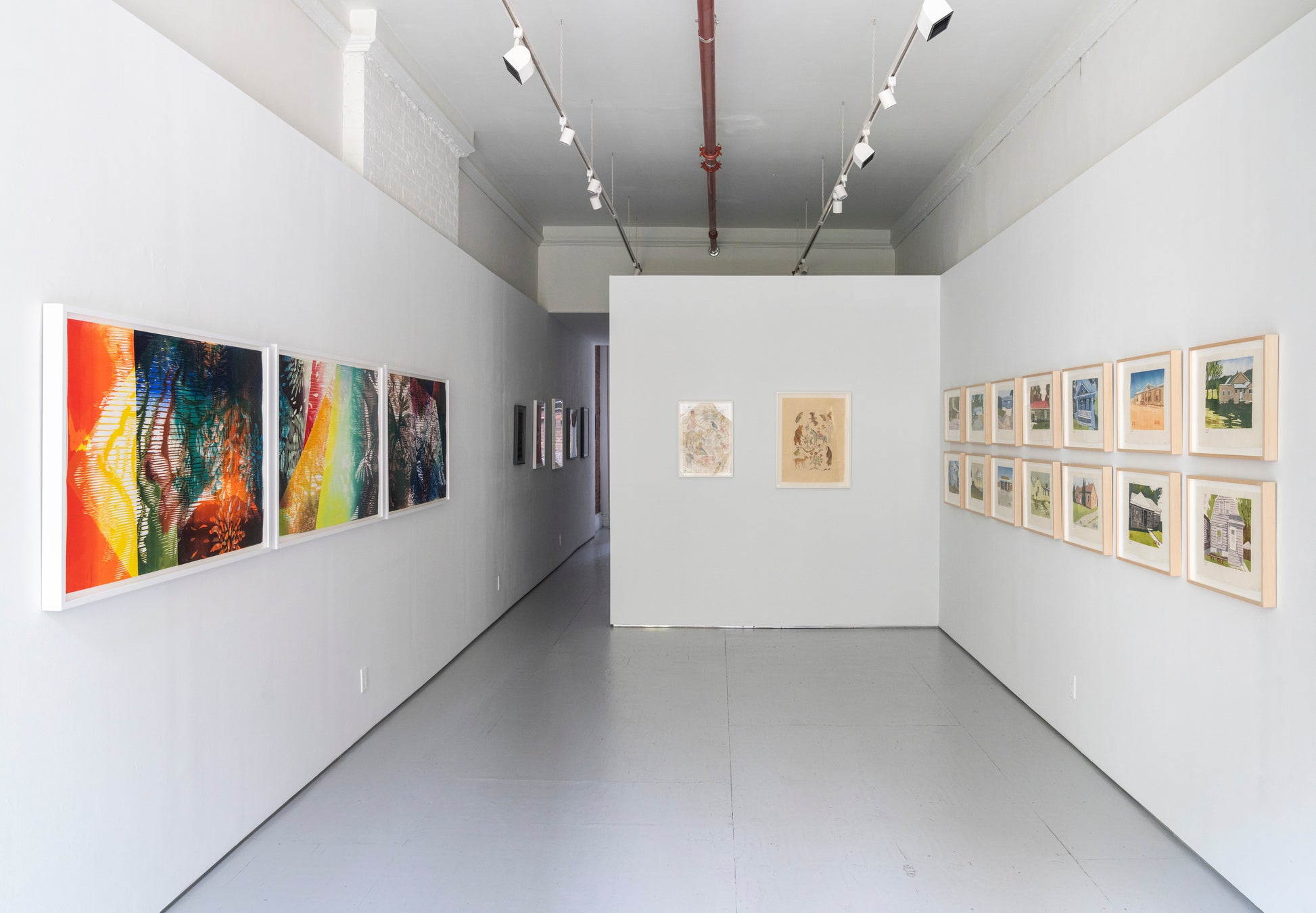 Collaboration is often integral to printmaking adventures, guiding and deepening the creative process. Works like Katherine Bradford’s Giraffe, Victoria Burge’s Cirrus, and Ross Bleckner’s Untitled were brought to life at The Grenfell Press, where gallery founder Katie Michel began her career in the print world. Created during the height of the pandemic in 2021, Silence, Dear Friend, and Ancestors commemorate Mildred Beltré and Oasa DuVerney’s Brooklyn Hi-Art! Machine project. In 2022, London-based Wuon-Gean Ho expanded her practice by collaborating with students at the University of Utah on her woodblock piece Hide ‘n Seek. That same year, printer and artist Janis Stemmermann worked with Margaret Garrett to produce her Terpsichore’s Garden monoprint series in Brooklyn. Nina Jordan’s self-editioned 14 Homes for 129K woodcuts feature captions printed by Ruth Lingen of Line Press Limited in 2023.