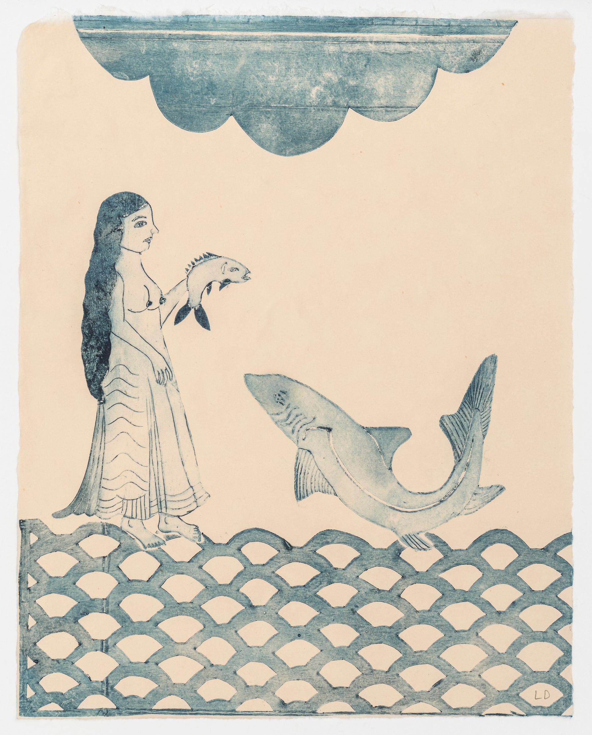Over the past few years, her prints have been created using plant milk boxes as a matrix. The resulting Tetra-Pak prints are drypoint prints composed of a collage of elements. The Swimmers series began as drawings. There is a growing body of characters and elements that create a narrative. Most of her prints are unique or made in limited editions due to the transience of the materials.