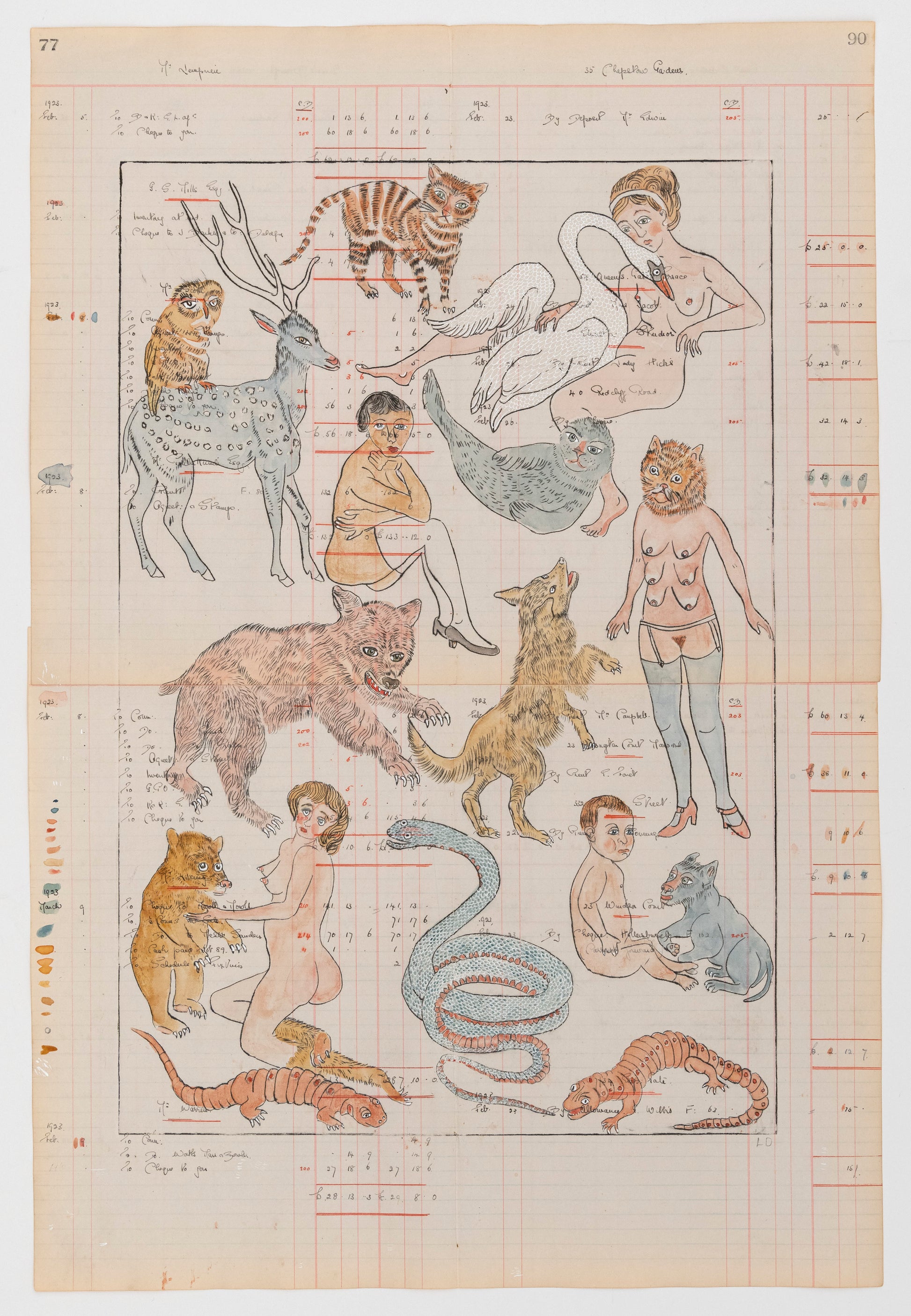 Betes Humaines series: Drypoint and watercolor on assembled antique ledger paper