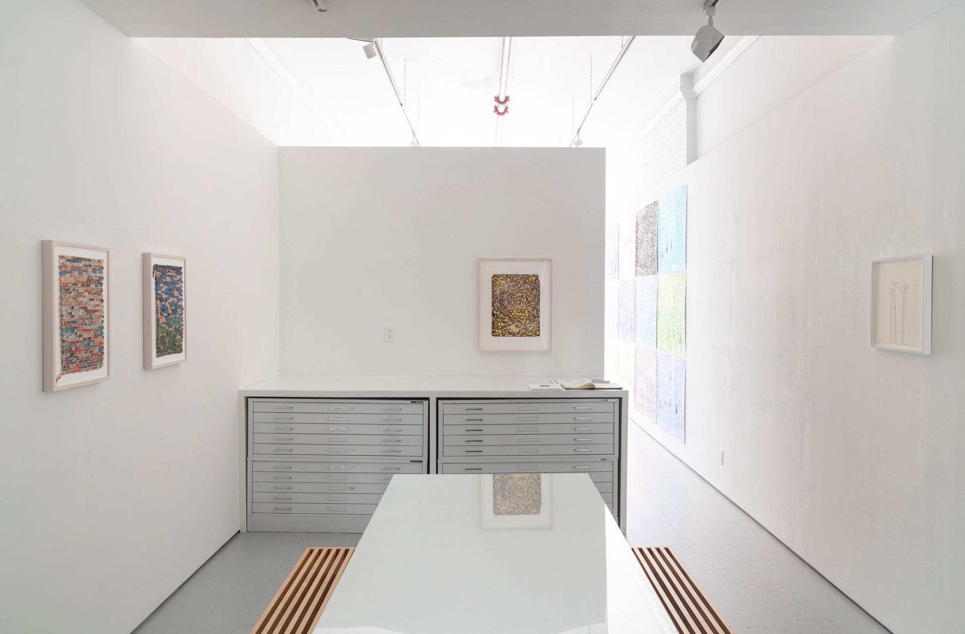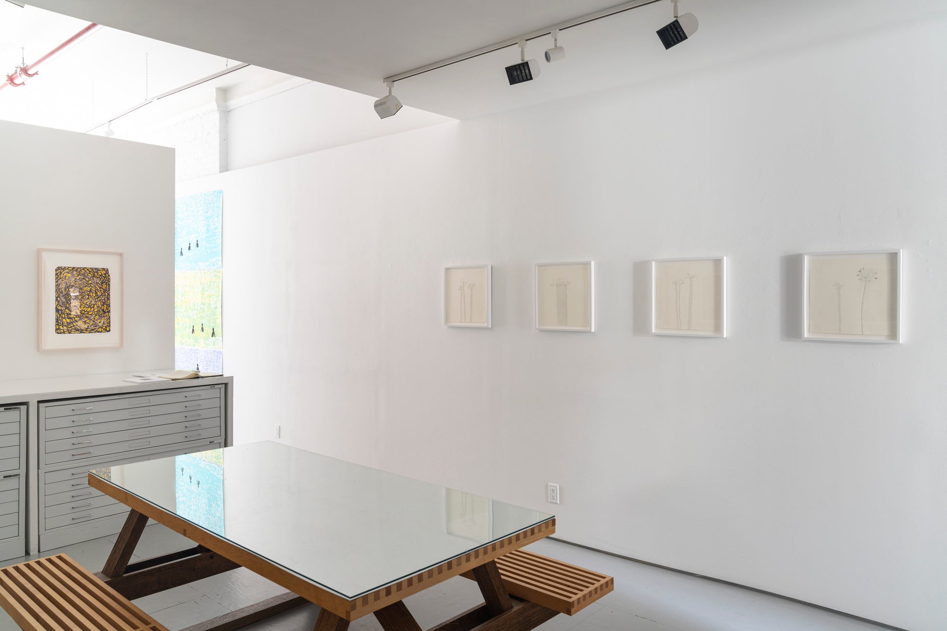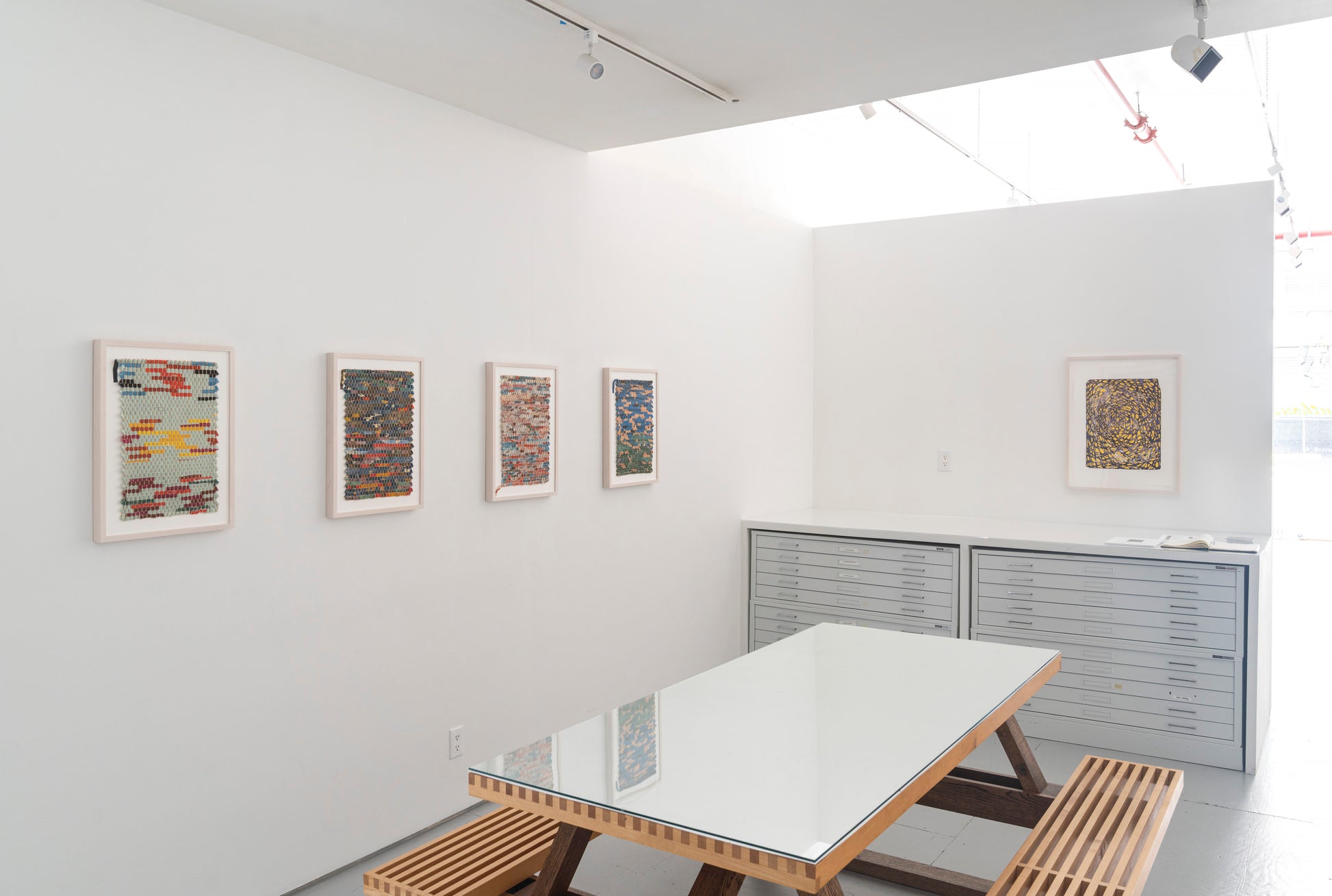 The back gallery features a new lithograph by Katia Santibañez from her series produced last year by Woolworth Publications, Paris. This series is featured in the gallery’s website’s flat files. UK-based artist Mandy Bonnell contributes four letterpress drawings created during a recent residency at the Oak Spring Garden Foundation, Virginia. Finally, four woven works by Laurie Lambrecht complement her outdoor installation Bark/Cloth, currently on view at the gallery.