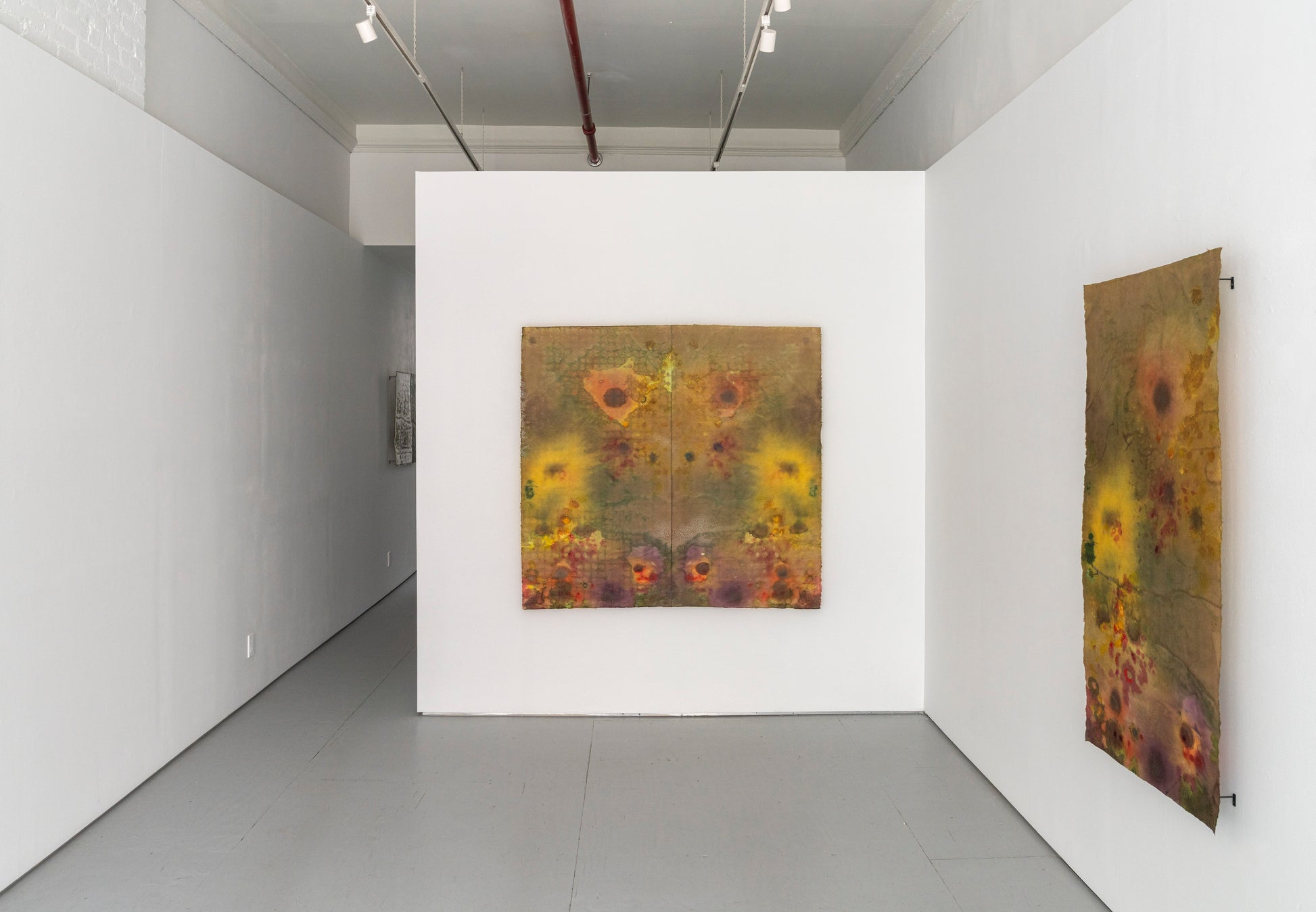 Procion dyes, embroidery, hand-cut perforations on Japanese paper