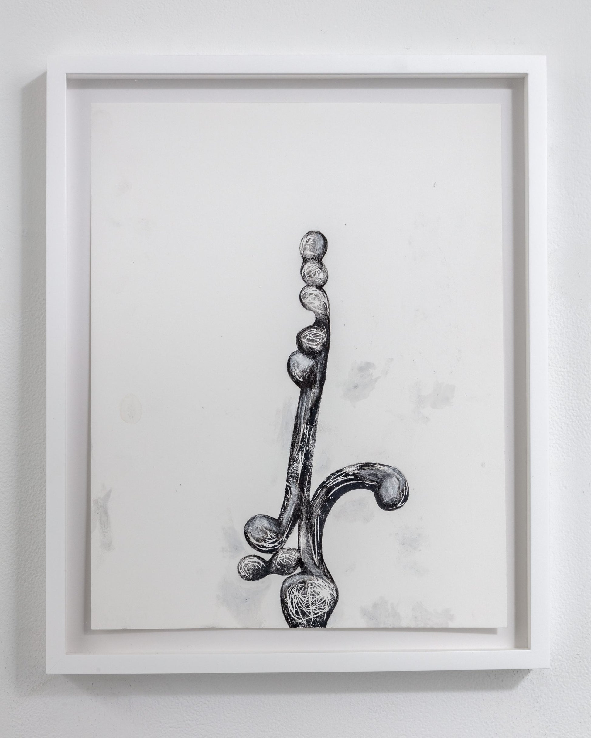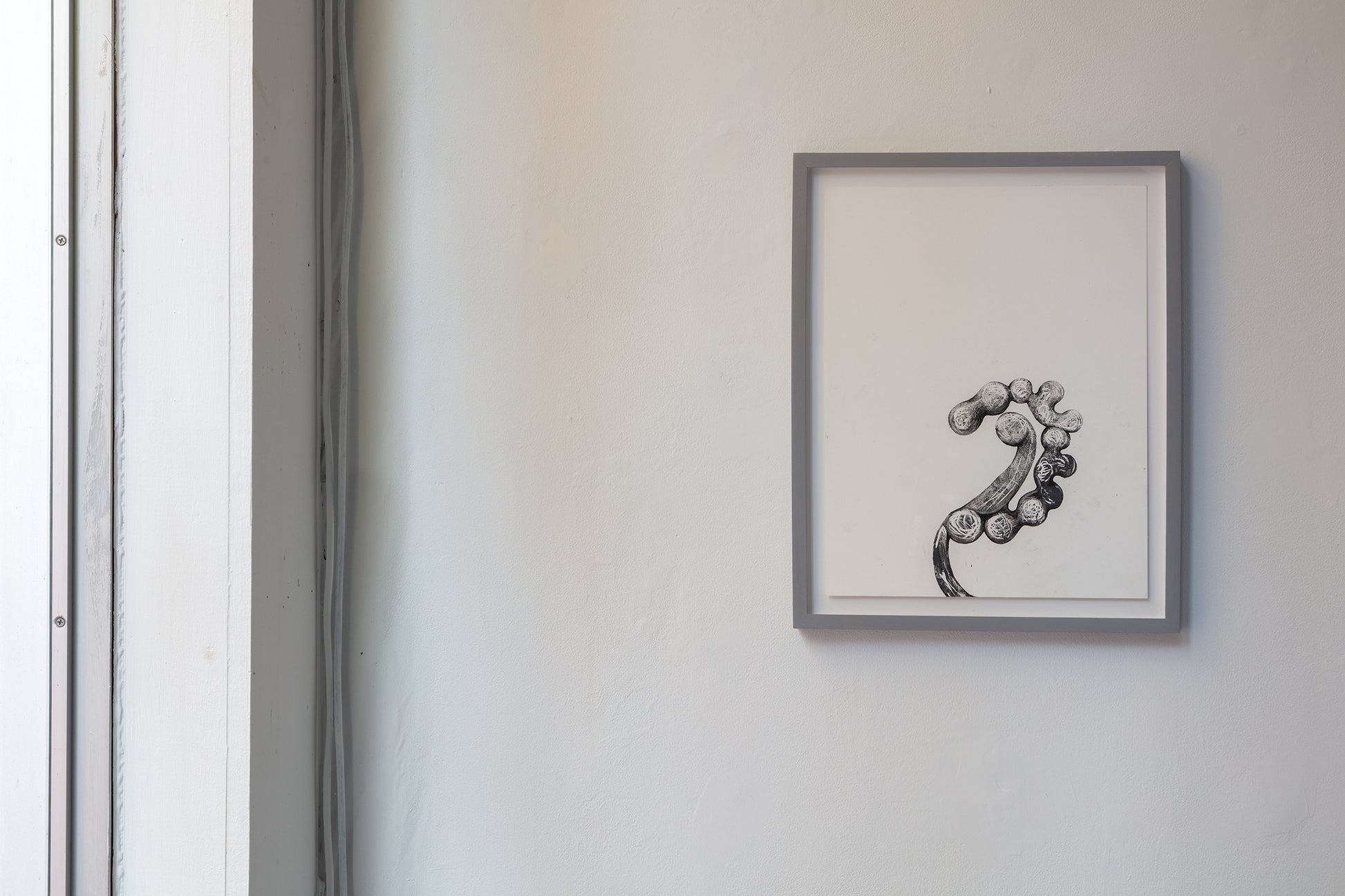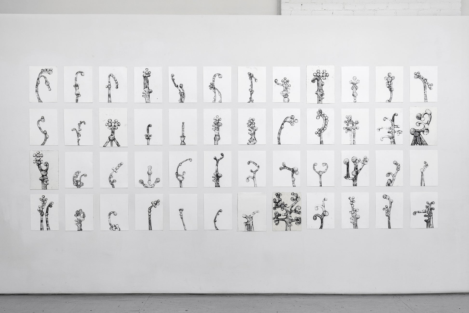 Months into the strangely blooming drawings, during the winter surge, I went to an art store with my seven-year-old. We happened upon envelope-sized sheets of soft, fake linoleum to make fabric stamps. Who knew there was such a thing as fake linoleum? By the end of the week, I advanced to pink linoleum, and within a few months, I’d carved scores of bulb-ish things and stems and unfurlings and then inked, combined, and pressed them onto many notebooks of paper. I didn’t know much about printing. I made lots of mistakes. I drew in fixes. Then I’d draw in a few connections and lumps. None ended up like the one following.