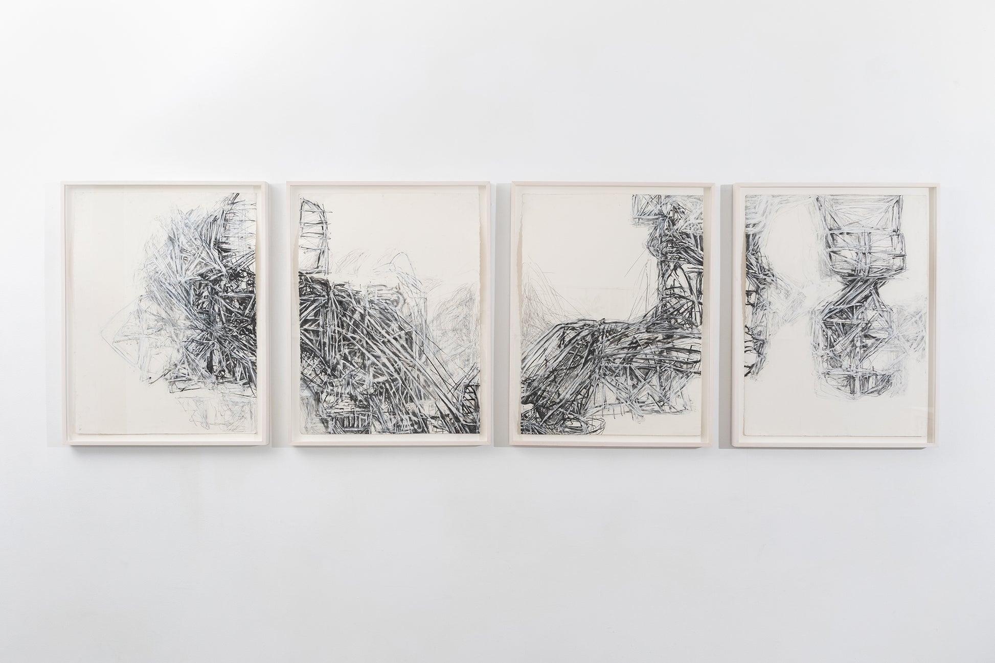 There are also two—almost nine-foot—collaged drawings of what I call my giraffes. I tape and glue pieces of other drawings—pieces that seem alive—onto the wall until I feel a creature’s quietness. They blow through their lips while I work and add a note of faint, preposterous magnificence.