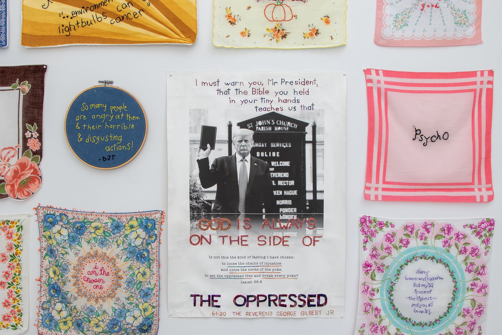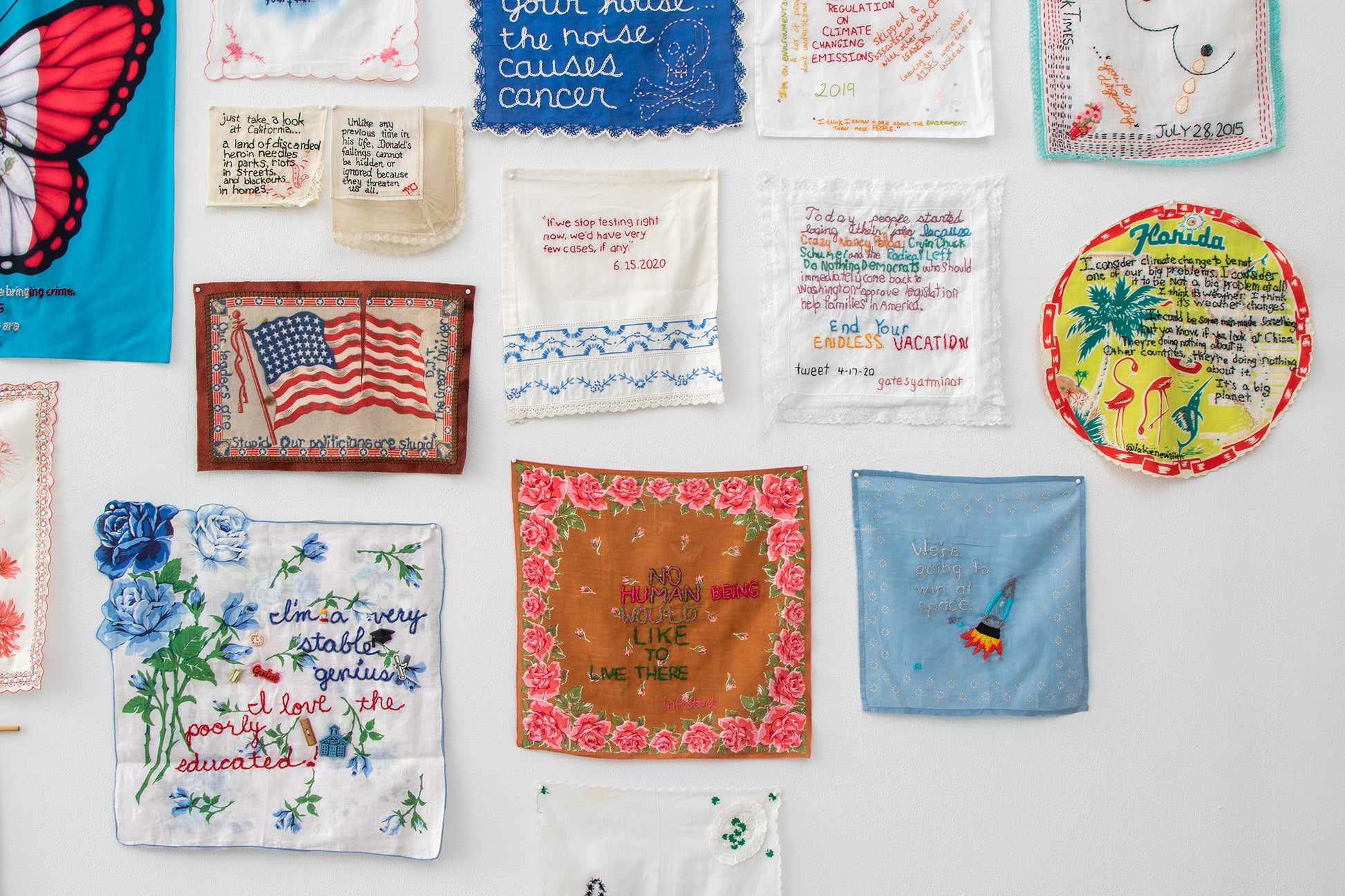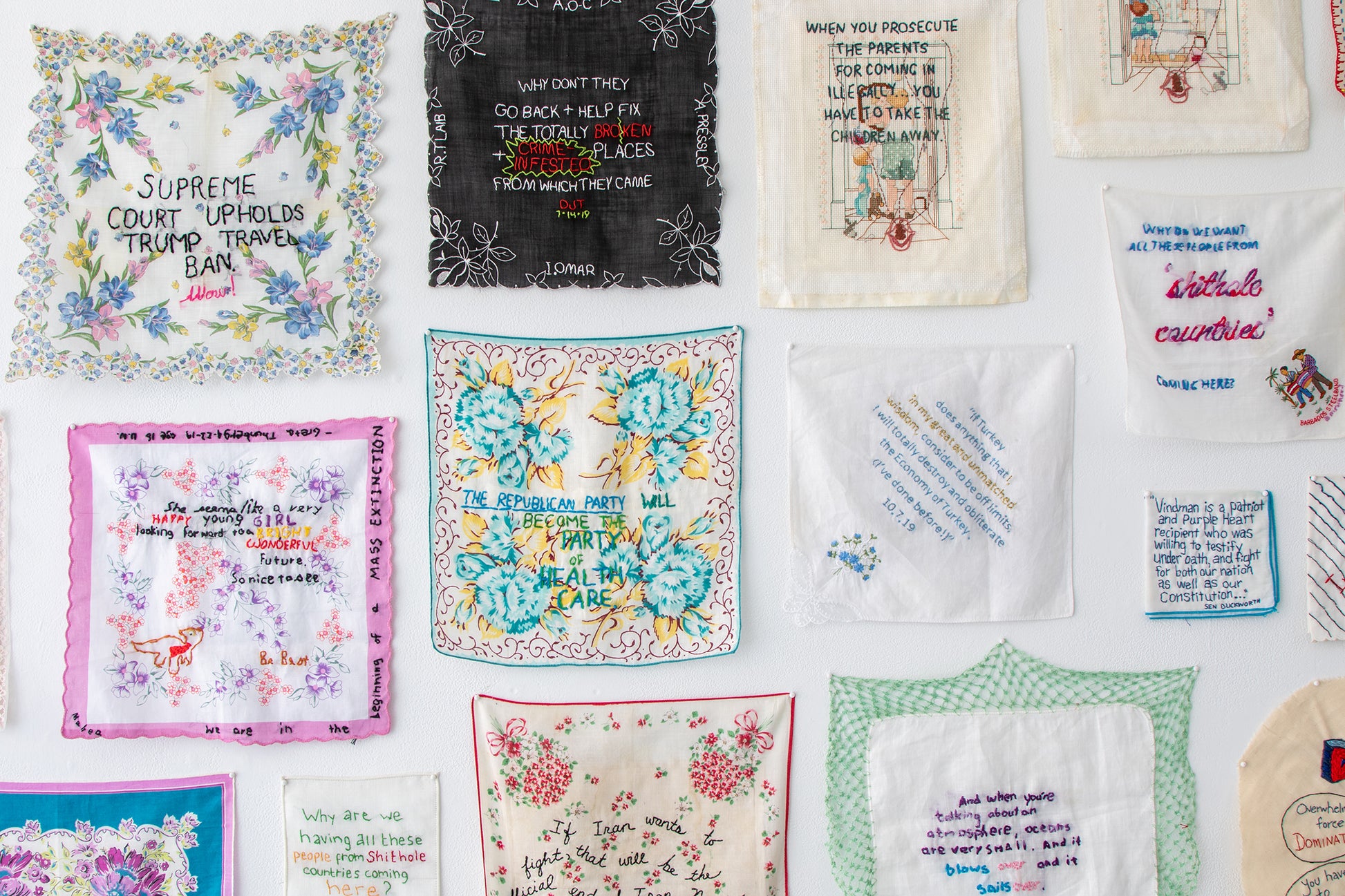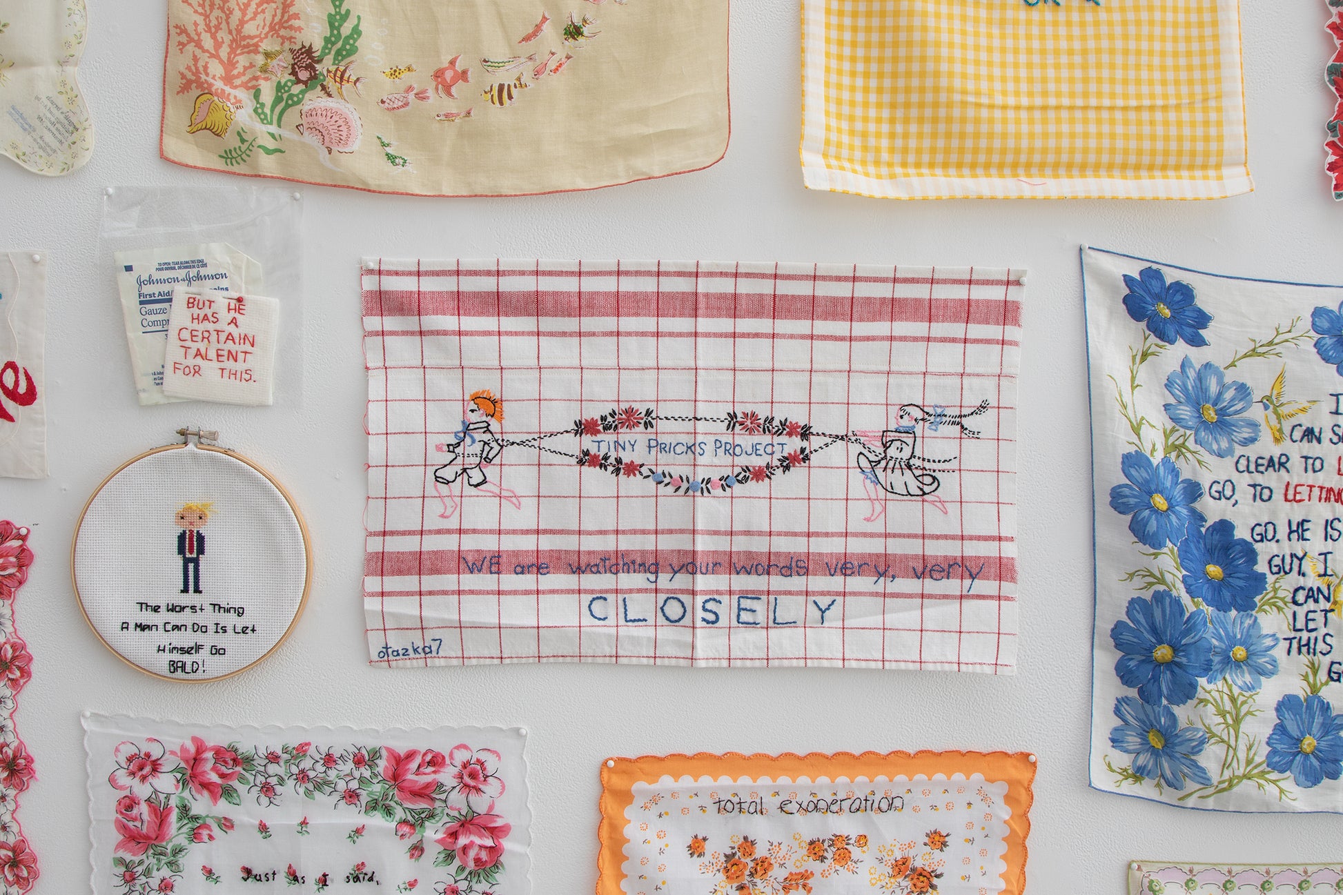 Tiny Pricks Project is a public art project created in 2018 and curated by Diana Weymar that is now a collection of over 3,500 pieces. Contributors from around the world are stitching Donald Trump's words into vintage textiles, creating the material record of the language of his presidency and of the movement against it. Tiny Pricks Project holds a creative space in a tumultuous political climate. The collection counterbalances the impermanence of Twitter and other social media, with the textiles that embody warmth, craft, permanence, civility, and a shared history. The daintiness and integrity of each piece stand in stark contrast to his presidency.