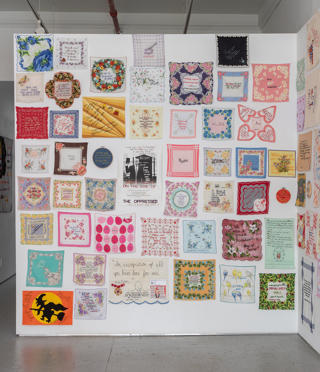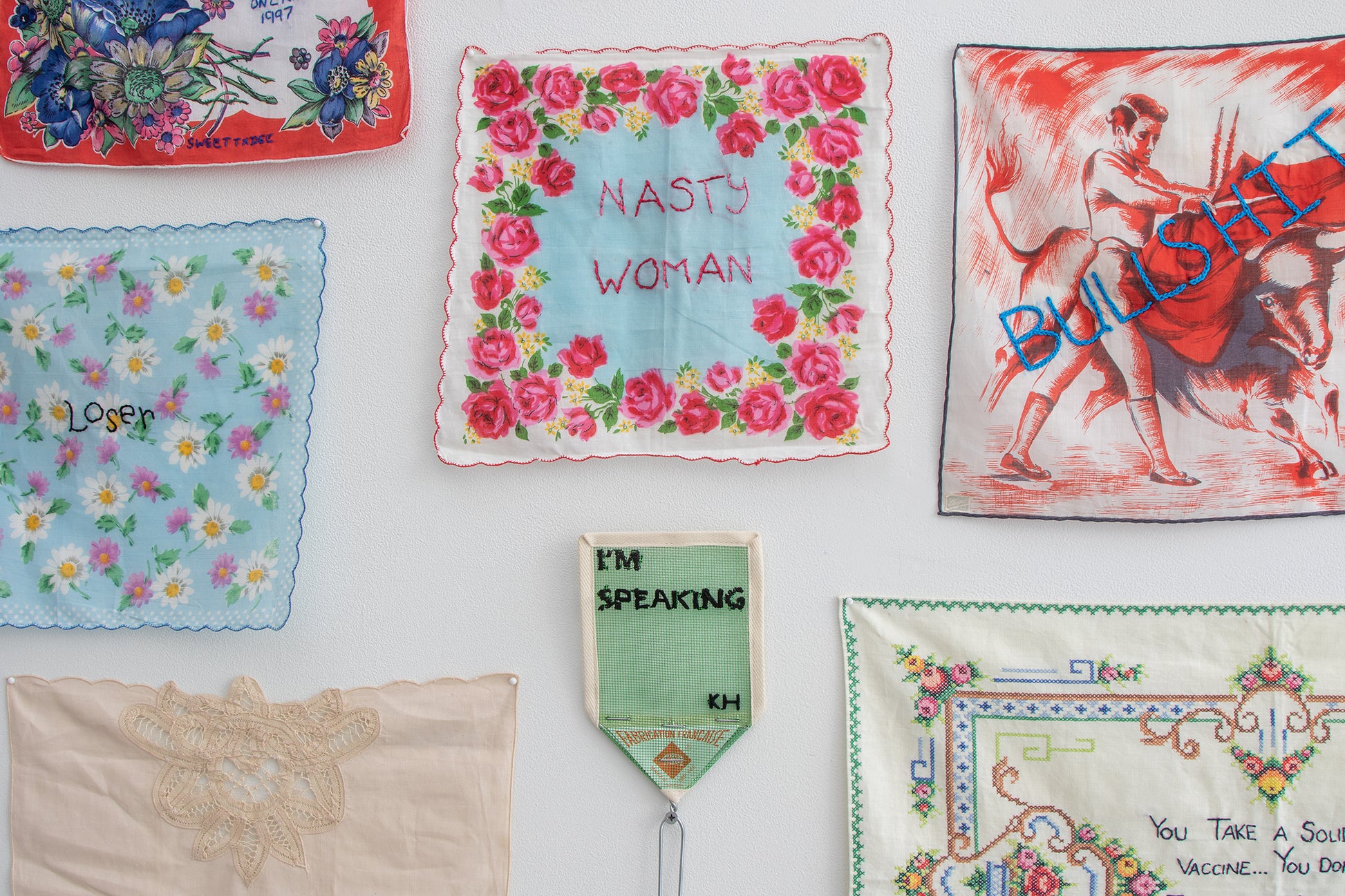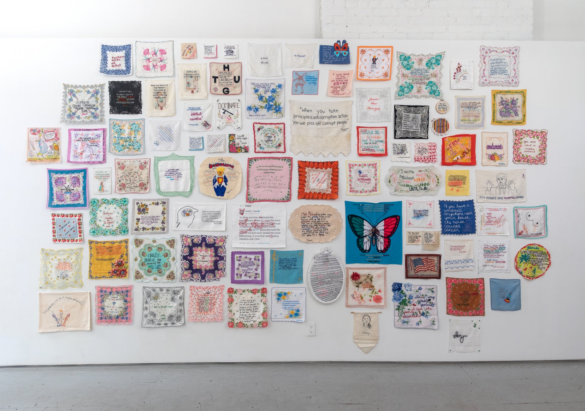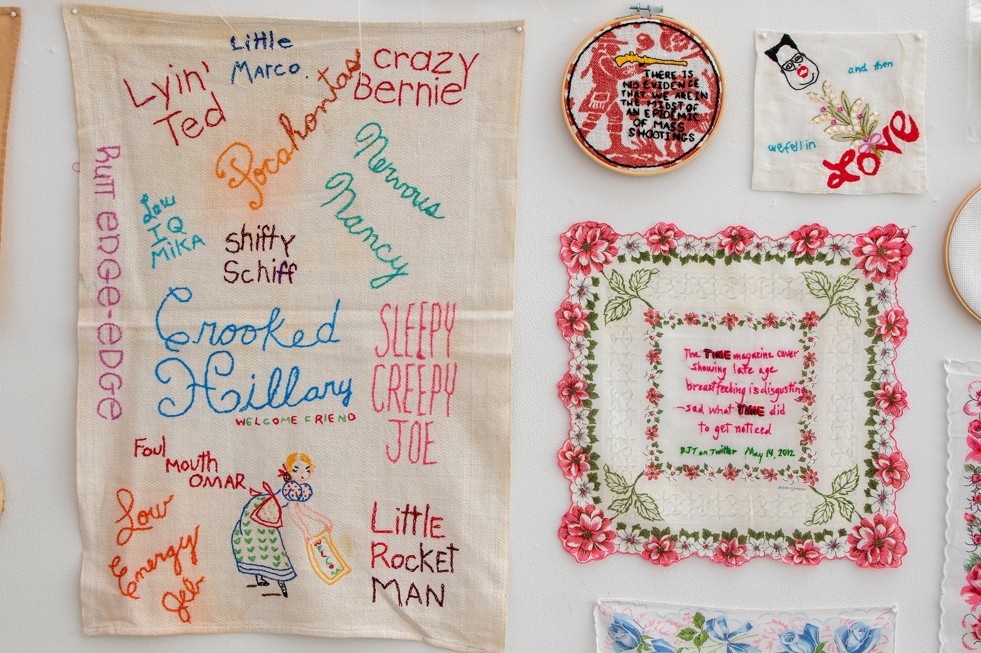 Tiny Pricks Project is a public art project created in 2018 and curated by Diana Weymar that is now a collection of over 3,500 pieces. Contributors from around the world are stitching Donald Trump's words into vintage textiles, creating the material record of the language of his presidency and of the movement against it. Tiny Pricks Project holds a creative space in a tumultuous political climate. The collection counterbalances the impermanence of Twitter and other social media, with the textiles that embody warmth, craft, permanence, civility, and a shared history. The daintiness and integrity of each piece stand in stark contrast to his presidency.