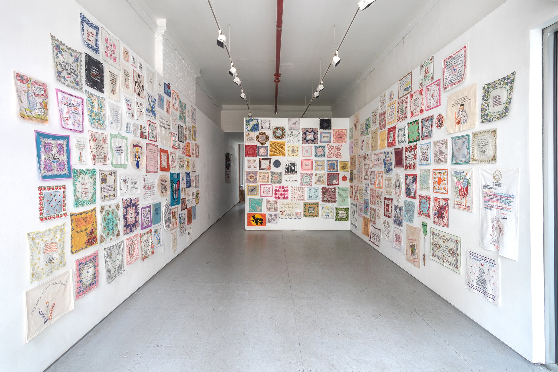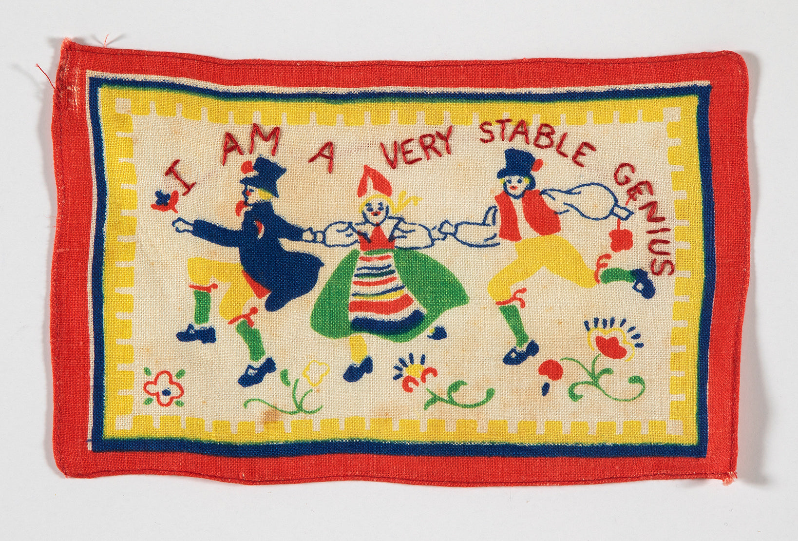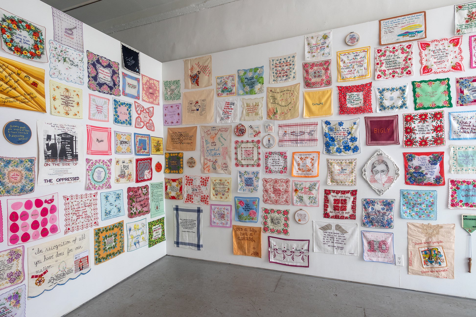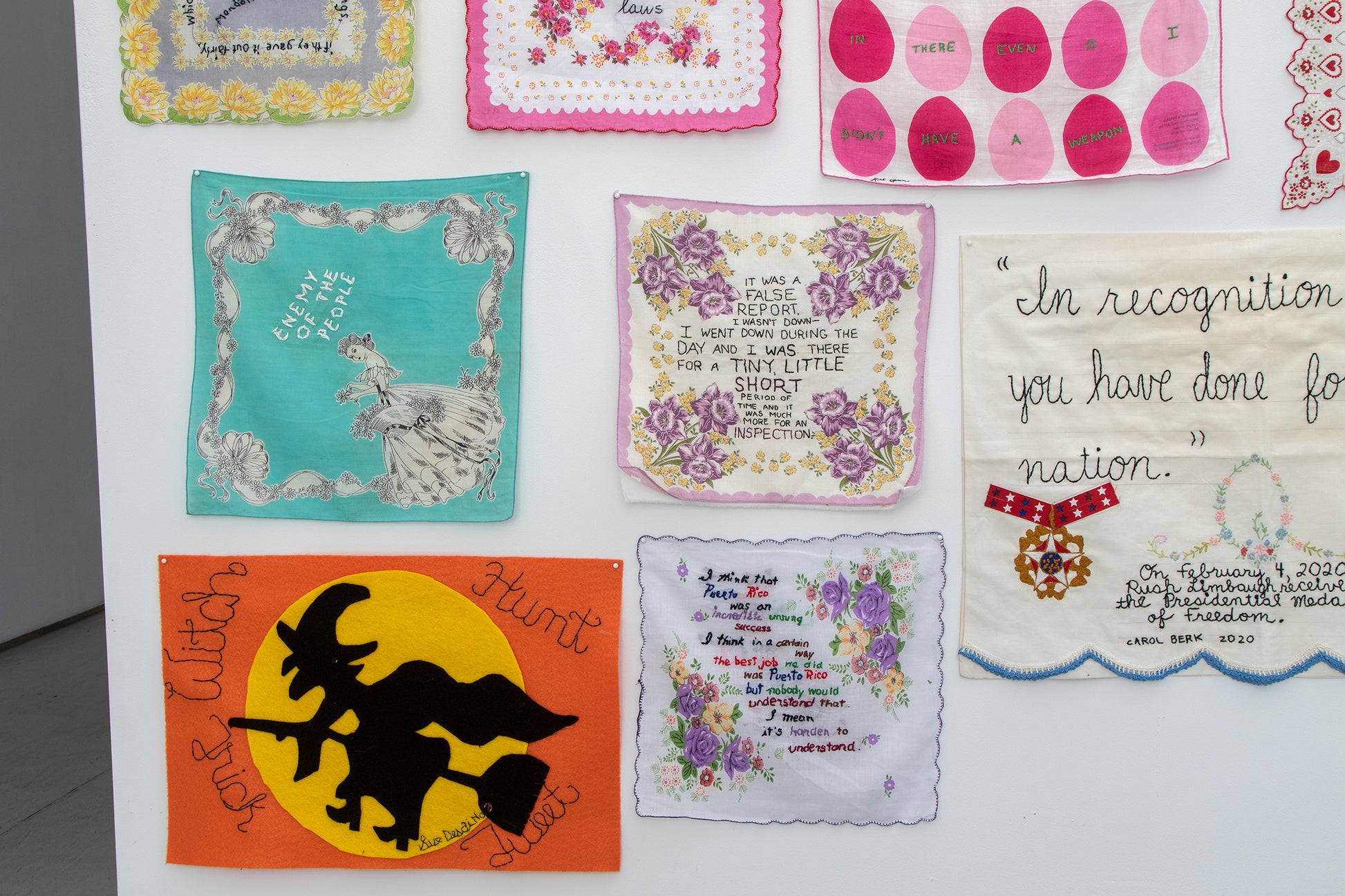Tiny Pricks Project is a public art project created in 2018 and curated by Diana Weymar that is now a collection of over 3,500 pieces. Contributors from around the world are stitching Donald Trump's words into vintage textiles, creating the material record of the language of his presidency and of the movement against it. Tiny Pricks Project holds a creative space in a tumultuous political climate. The collection counterbalances the impermanence of Twitter and other social media, with the textiles that embody warmth, craft, permanence, civility, and a shared history. The daintiness and integrity of each piece stand in stark contrast to his presidency.