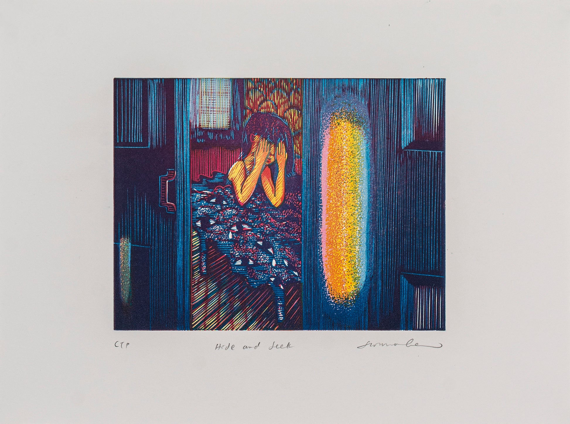 Wuon-Gean Ho was born in 1973 in Oxford and raised in the UK by Malaysian and Singaporean parents. She received a BA in Art History from Cambridge University and an MA in Printmaking from the Royal College of Art. She also studied Japanese woodblock printmaking at the Kyoto Seika University in Japan. Ho has taught printmaking internationally for over 15 years and participated in residencies in the US, Canada, China, Italy, and the UK. Her work has been shown internationally and extensively in the UK. She is currently a research associate and the inaugural editor of the IMPACT Printmaking Journal for the University of the West of England. Ho is known for her expressive, colorful linocuts about intimacy, tenderness, and connection. Her work commonly features people and animals in comedic, absurd, or affectionate situations. She aims to balance complex situations with limited scale and layering of blocks.